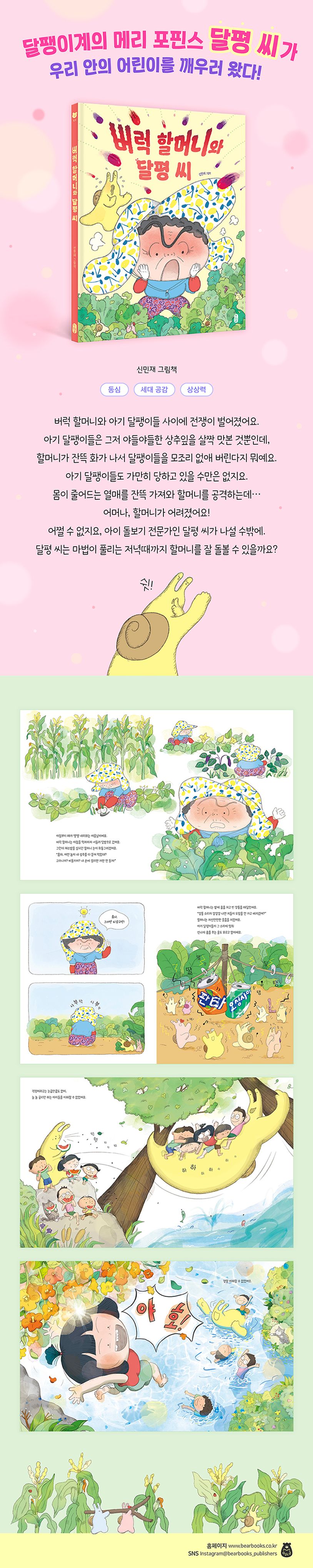 심술궂기로 이름난 버럭 할머니와 아기 달팽이들 사이에 전쟁이 벌어졌다. 아기 달팽이들은 그저 야들야들한 상추잎을 조금 맛본 것뿐인데, 할머니가 잔뜩 화가 나서는 달팽이들을 모조리 없애 버리겠단다. 하지만 아기 달팽이들도 가만히 당하고 있을 수만은 없다. 새총과 몸이 줄어드는 마법 열매를 잔뜩 가져와 공격에 나서는데… 이런, 할머니가 작아진 게 아니라 어려졌다! 이럴 땐 누구? 그렇다, 아이 돌보기 전문가 달평 씨가 나설 차례다! 달평 씨는 마법이 풀리는 저녁때까지 투덜투덜 잔소리도 많고 버럭버럭 화도 많은 할머니를 잘 돌볼 수 있을까? 신민재 작가가 들려주는 달팽이계의 메리 포핀스, 달평 씨 다섯 번째 이야기.