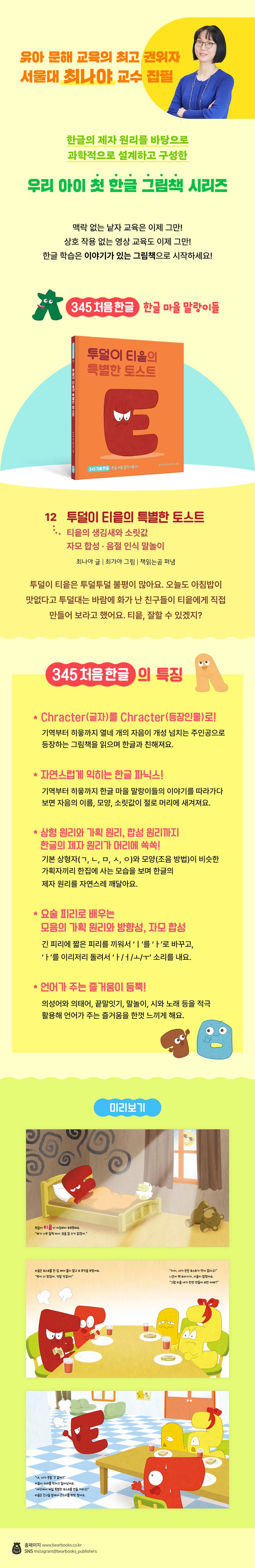 그밖에도〈345처음한글〉의세계관속에는한글의제자원리가자연스럽게녹아있습니다.한글마을에서는기역과키읔(어금닛소리),니은과디귿과티읕과리을(혓소리),미음과비읍과피읖(입술소리),시옷과지읒과치읓(잇소리),이응과히읗(목구멍소리)처럼조음원리가같은친구들끼리한집에삽니다.한집에사는친구들의이름을소리내어읽고생김새를비교해보며자음의상형원리와가획원리를자연스럽게익힐수있지요.첫소리가같은자음을반복해리듬감과운율을만드는두운법,의성어와의태어,끝말잇기,시와노래들을적극적으로활용해언어가주는즐거움을한껏느껴볼수있도록구성한점도빼놓을수없습니다.