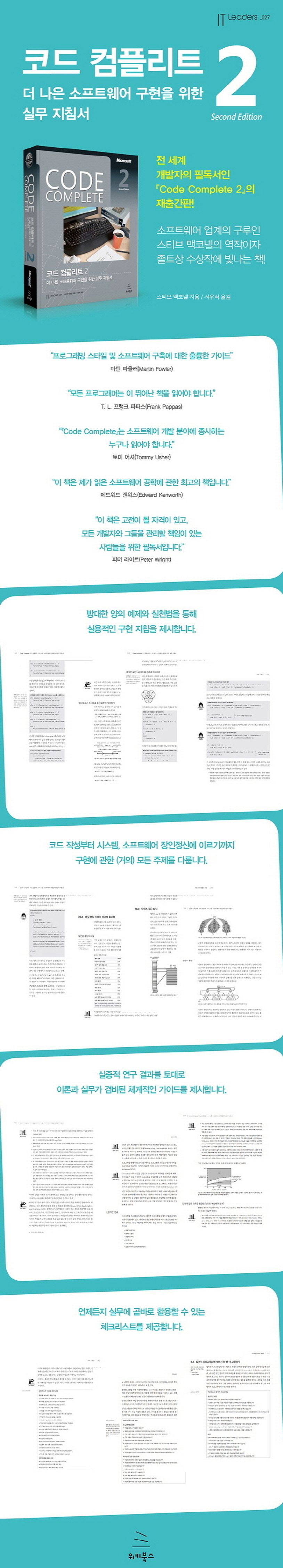 《Code Complete 2》는 소프트웨어 구현을 둘러싼 다양한 비유부터 기초적인 프로그래밍, 시스템 구축, 소프트웨어 장인정신에 이르기까지 소프트웨어 업계에 종사하는 분이라면 누구나 읽어야 할 필독서입니다.