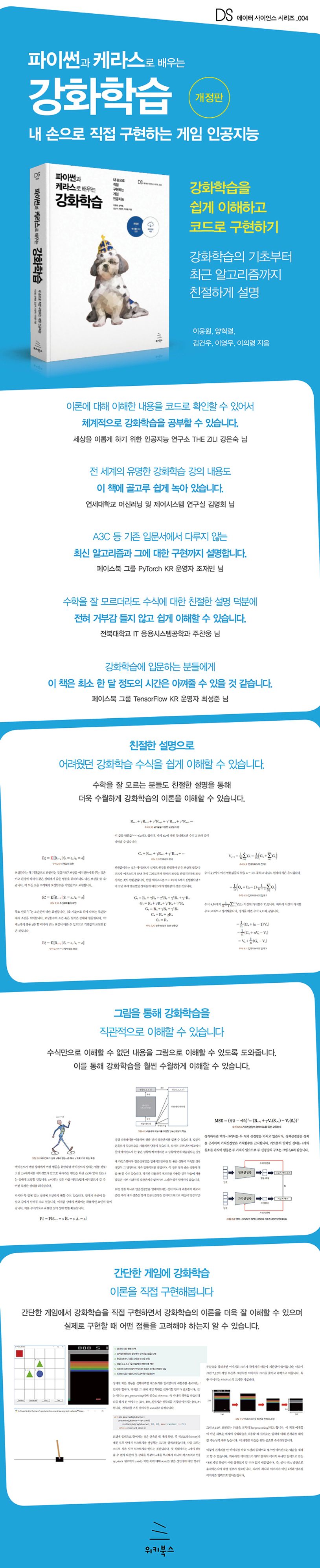 저자:이웅원 연세대학교기계공학과를졸업했다.'모두의연구소'에서개최한강화학습스터디에참여해공부하면서강화학습관련깃북(https://www.gitbook.com/book/dnddnjs/rl)을작성했다.현재는제이마플에서딥러닝을사용해소리를인식하는작업을하고있다. 저자:양혁렬 한양대학교에서경영학과컴퓨터공학을다중전공하고있다.현재는음악/오디오신호처리와기계학습을결합한분야에관심을가지고서울대학교융합과학기술대학원의음악오디오연구실에서연구원으로참여하고있다. 저자:김건우 뉴욕대학교에서컴퓨터과학학사학위를받았습니다.우버드라이버프라이싱팀에서소프트웨어엔지니어로근무합니다.대학교를다니며딥러닝과강화학습스터디그룹에참여하여『파이썬과케라스로배우는강화학습』(위키북스,2017)을공동집필했습니다. 저자:이영무 중앙대학교컴퓨터공학과에재학중이며'모두의연구소'에서개최한강화학습스터디에서공부했다.현재머신러닝,딥러닝에관련된공부를지속하고있다. 저자:이의령 세종대학교에서응용통계학과경영학을전공하고졸업후스타트업에서서버개발인턴으로근무했다.현재'모두의연구소'에서신호처리관련프로젝트를진행하면서머신러닝과관련된다양한경험을쌓고있다.