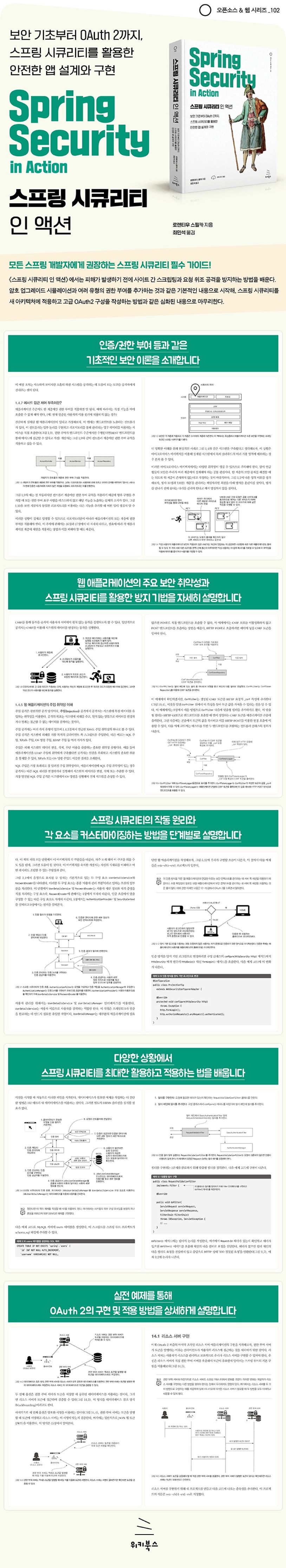 《스프링 시큐리티 인 액션》에서는 피해가 발생하기 전에 사이트 간 스크립팅과 요청 위조 공격을 방지하는 방법을 배운다. 암호 업그레이드 시뮬레이션과 여러 유형의 권한 부여를 추가하는 것과 같은 기본적인 내용으로 시작해, 스프링 시큐리티를 새 아키텍처에 적용하고 고급 OAuth2 구성을 작성하는 방법과 같은 심화된 내용으로 마무리한다. 이 책을 모두 공부하면 일반적인 위협은 물론 심각한 위협에도 대비하는 맞춤 구성된 스프링 시큐리티 구성을 만들 수 있게 된다.