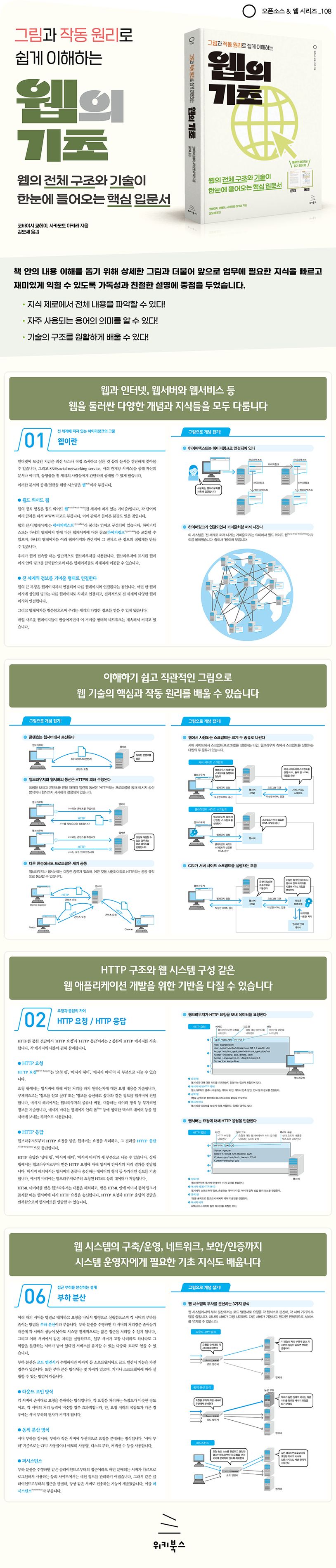 이 책은 IT 업계에 입문하는 ‘신입 엔지니어’나 ‘비IT 엔지니어 대상으로 ‘웹’에 관해 기본적인 개념을 설명합니다. 웹이란 무엇인가라는 역사에서 시작해, 웹과 밀접한 관계가 있는 인터넷/네트워크와의 관련성, HTTP 통신과 데이터 형식, 웹 애플리케이션/시스템의 기본적인 구성, 보안 고려 등 웹에 관한 다양한 요소를 체계적으로 다룹니다.