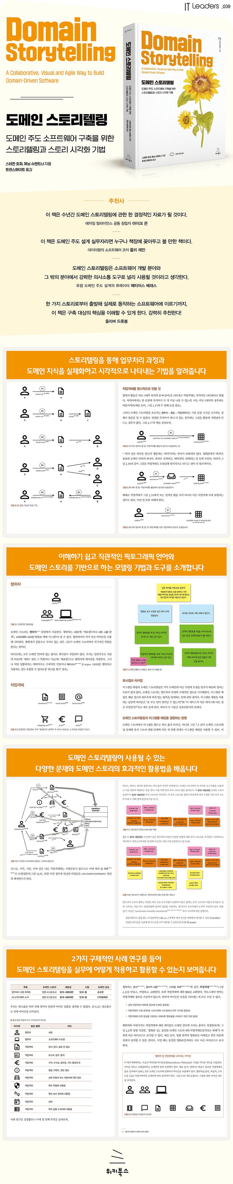 스토리텔링은 인간 커뮤니케이션의 핵심이다. 소프트웨어를 설계할 때 비용이 많이 드는 오해를 극복하는 데 스토리텔링을 활용해 보면 어떨까? 도메인 전문가와 팀원은 스토리텔링과 스토리 시각화를 통해 업무처리 과정과 도메인 지식을 실체화할 수 있다. 도메인 스토리텔링은 모든 이들로 하여금 업무와 관련된 사람, 활동, 작업 항목을 이해하도록 만들어준다. 이 방법론의 창시자들은 이 책을 통해 도메인 전문가와 팀이 협력해서 간단한 픽토그래픽으로 통찰력을 포착하고, 업무를 가시화하며, 피드백을 얻고, 모두가 같은 생각을 하도록 만드는 방법을 설명한다.