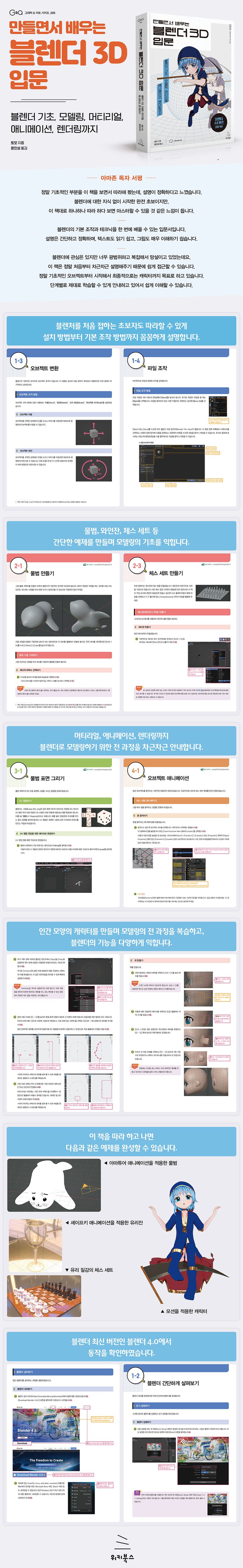 이 책은 블렌더를 전혀 다루어본 적이 없는 분, 조금 알고 있지만 더 깊게 공부하고 싶은 분, 3D CG 자체를 접해본 적이 없는 분들을 위한 입문서입니다. 앞부분에서 간단한 연습 목적의 모델을 몇 개 만들어 보면서 기본적인 조작 방법을 차근차근 배웁니다. 나아가 최종적으로 조금 복잡한 캐릭터를 만들어 보며 블렌더의 기능을 최대한 다양하게 익힐 수 있게 구성했습니다.