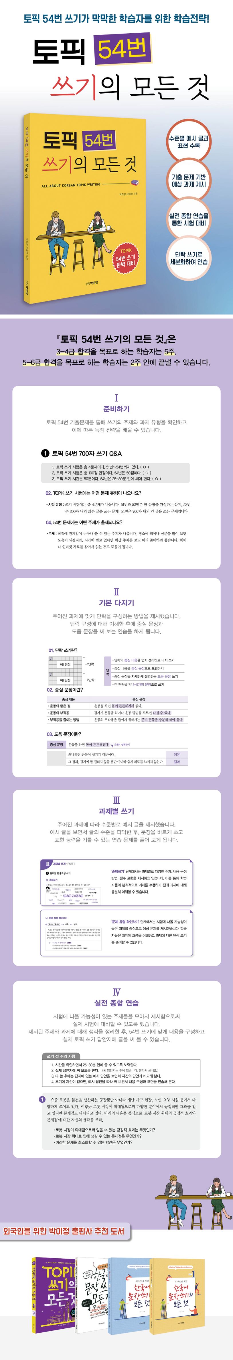좋은 성적을 얻기 위해서는 꾸준한 노력이 필요하지만 이 책으로 공부한다면 가장 효과적으로 TOPIK 54번 쓰기를 준비할 수 있을 것입니다.