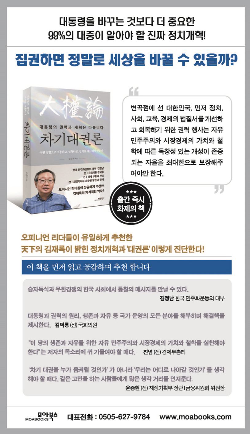 또 한 번의 선거를 앞두고 이 시대에 새로운 시대의 대권주자는 국가와 민족의 미래를 향해 잠재력과 비전을 제시하고, 자유민주주의와 시장경제의 가치와 철학을 통해 이를 실천해야 할 것이다. 이제 낡은 고정관념과 구태 정치를 넘어 시대를 초월한 근본적인 변화와 정치개혁을 추진하며 완성해야만 한다. 그리고 대권에 출마한 후보자는 대중의 지지와 검증을 통한 판단을 투표로 결정해야 하는 벼랑 끝에 서 있지만 국민들은 주권을 포기 할 수는 없다. 후보를 검증하는 구체적인 시각과 함께 국민들에게 다가갈 수 있는 해법과 전략이 필요한 절체절명의 시간, 이제 차기 대권론을 통한 한국의 미래를 그려보아야 한다. 이 땅의 번영과 행복을 위해, 차기 대권주자는 무엇을 어떻게 해야 하는지와 함께 대중의 지지와 심판의 힘은 오직 국민만이 갖고 있음을 강조한다.