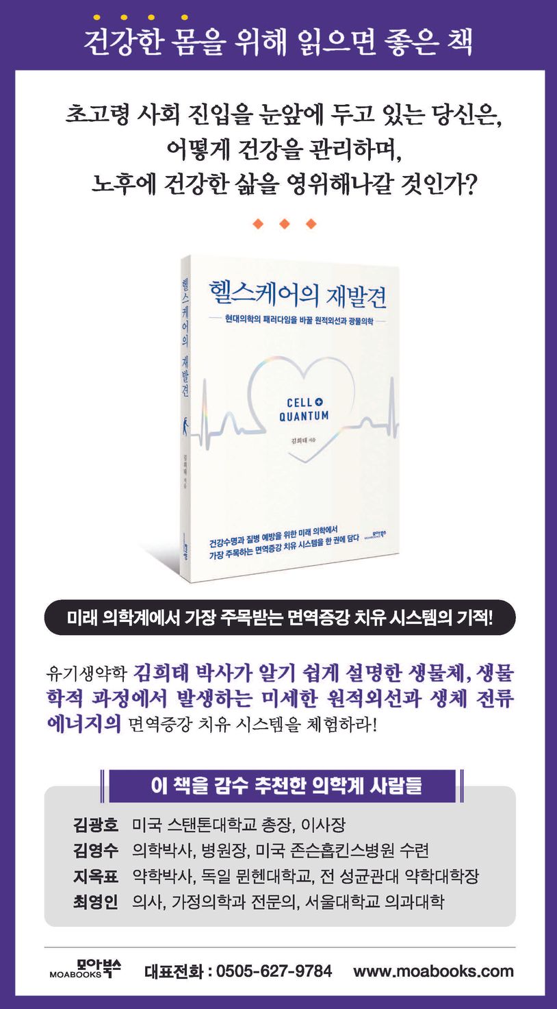 이 책은 생명과 지능의 본질이라고 할 수 있는 ‘생체 전기’인 원적외선 현상을 상세하게 다루며 생체 전기를 이용하여 건강한 세포로 되돌릴 수 있고 세포, 장기와 함께 건강한 신체를 유지할 수 있음을 알기 쉽게 설명한다.