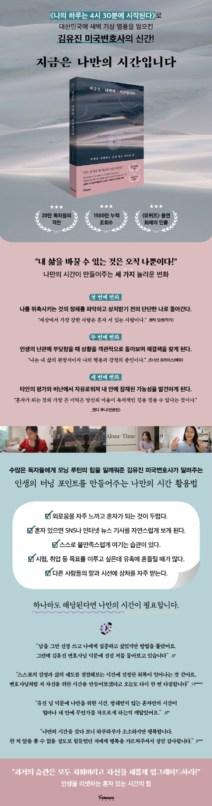 진정으로 혼자가 되어본 적 있는가? 의외로 많은 사람들이 혼자 있기를 두려워한다. 새로운 취미를 시작할 때도 친구와 함께하고 홀로 여행을 떠나는 것은 무섭다며 꿈도 꾸지 않는다. 어쩌다 혼자 있게 된 주말, 나를 만나줄 사람이 없을지 SNS를 샅샅이 훑는다. 반면 미국 2개 주의 변호사 자격증을 가진 변호사이자 베스트셀러 《나의 하루는 4시 30분에 시작된다》로 많은 독자들에게 사랑을 받아온 김유진 미국변호사는 ‘혼자가 되어야만 최고의 나를 만날 수 있다’고 이야기한다.