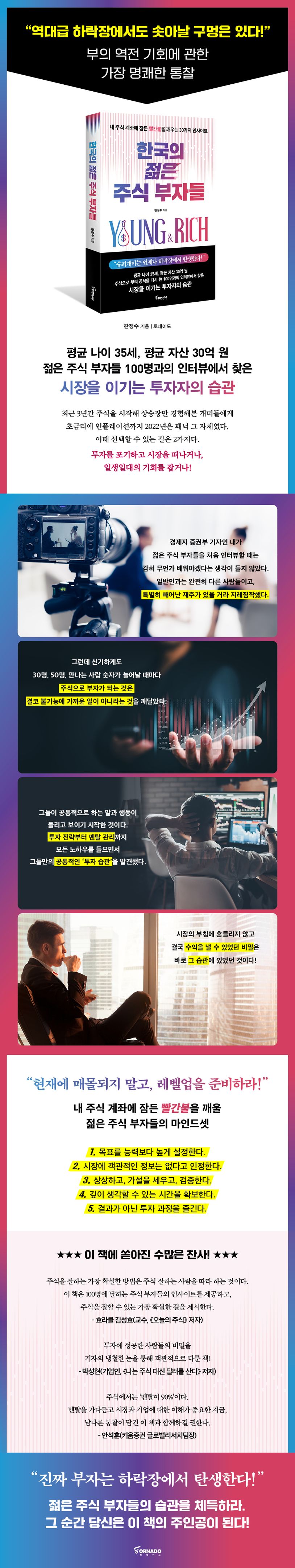 또한 많은 사람들이 주식으로 부자가 되지 못하는 이유에 대해 짚어주고, 투자 과정에서 생길 수 있는 다양한 문제에 대해 가장 현실적인 해법을 제시한다. 젊은 주식 부자들이 0에서부터 경험과 자금을 축적해온 과정이 궁금한가? 그들이 공통적으로 꼽는 투자책이 무엇인지 알고 싶은가? 그들이 어떤 관점으로 세상을 읽고 돈으로 연결시키는지 배우고 싶은가? 그들이 종목을 어떻게 고르고, 하락장을 새로운 기회로 이용하는지 궁금한가? 그렇다면《한국의 젊은 주식 부자들》이 답이다.