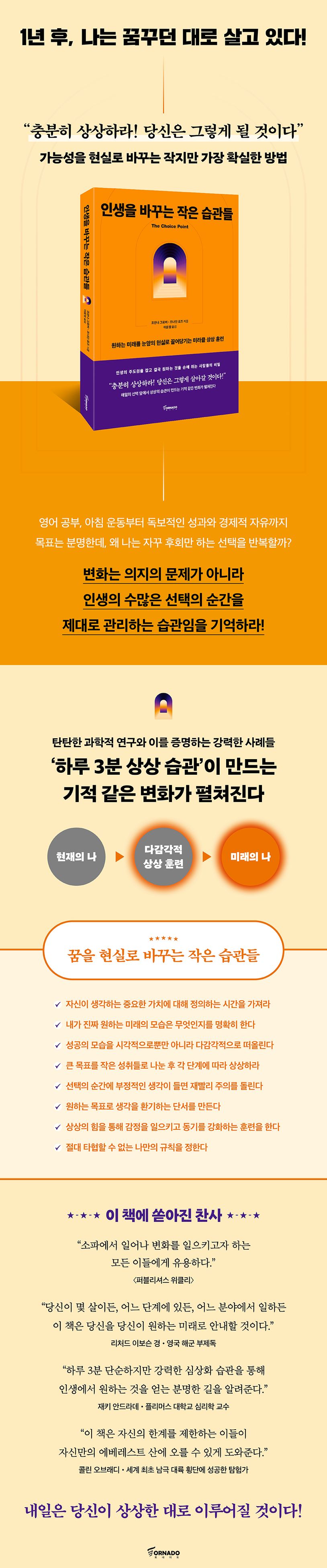 인지심리학자이자 성과 컨설턴트로 그동안 기업가, 스포츠 선수, 학생 등 수많은 사람들의 꿈을 현실로 바꾸어온 이 책의 저자들은 실패의 원인으로 우리의 의지를 탓하지 않는다. 변화를 만들어내는 진짜 힘은 우리의 끈기나 열정보다 선택의 순간을 컨트롤하는 능력에 따라 좌우되기 때문이다. 따라서 목표를 이루기 위해서는 의지를 강화하려고 애쓰기보다 의식 속으로 들어오는 생각을 관리해야 하는 것이다. 이에 그들은 이 책을 통해 목표를 향해 계속 나아갈 것인가, 포기할 것인가를 결정하는 인생의 크고 작은 선택의 순간에 자신의 궁극적인 목적과 가치에 부합하는 결정을 내리도록 돕는‘기능적 심상화 훈련(FIT, Functional Imagery Training)의 세계로 독자들을 안내한다. 우리가 해야 할 일은 심플하다. 현재의 나를 스스로가 원하는 미래의 나로 데려가기 위해서 자신의 목표를 더 생생하게 상상하는 것이다. 저자들은 탄탄한 과학적 연구 결과와 이를 뒷받침하는 강력한 사례를 바탕으로 매일의 습관으로 자리 잡은 상상의 힘이 어떻게 우리의 동기를 강화하고, 인생의 수많은 선택의 순간에 올바른 행동을 하도록 이끄는지를 선명하게 보여준다.