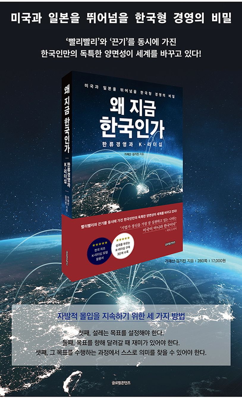 『왜 지금 한국인가』는 한국인의 DNA와 MZ세대의 특성을 고려한, 한국 최초의 한국형 리더십 모델 활용서다. 최근 한국형 경영이나 기법이 전 세계적인 관심과 이슈로 대두되고 있으나, 관련 연구나 발간된 책자는 극소수에 불과하다. 게다가 한국의 경제적 위상이나 기업들이 일구어 낸 성과에 걸맞은 우리식의 리더십 연구나 모델은 거의 존재하지 않는다. 해방 이후 도입된 일본식 경영 모델과 IMF 이후에 주도적으로 도입한 미국식 성과주의 경영 모델이 기업 성장에 큰 기여를 한 것은 사실이지만, 21세기 기업 경영에서 그 한계점이 드러나면서 한국형 인사 제도와 한국인 특성에 적합한 리더십 연구가 요구되고 있다.
