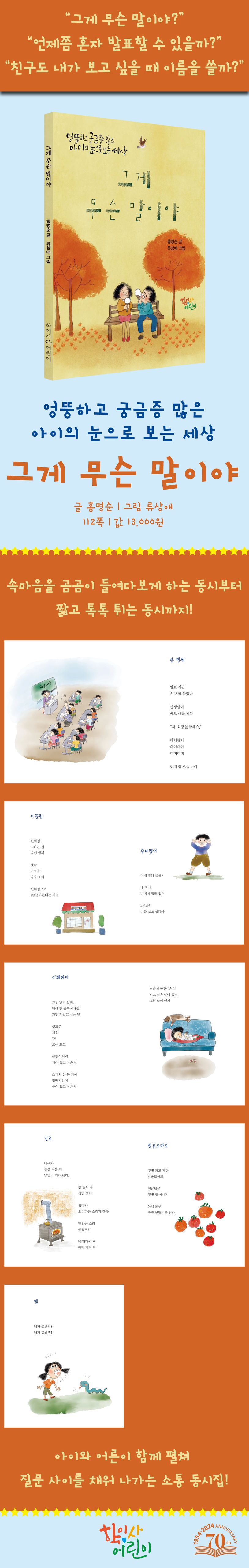 동시를 통해 아이들의 세상에 더욱 가까이 다가가고자 하는 홍명순 동시 선생님은 말글연구소를 운영하면서 글쓰기와 말하기를 가르치고 있습니다. “그게 무슨 말이야?” “언제쯤 혼자 발표할 수 있을까?” “친구도 내가 보고 싶을 때 이름을 쓸까?” 『그게 무슨 말이야』에는 아이와 어른이 함께 동시집을 펼쳐 질문 사이를 채워 나갈 수 있는 소통 동시 75편을 실었습니다.