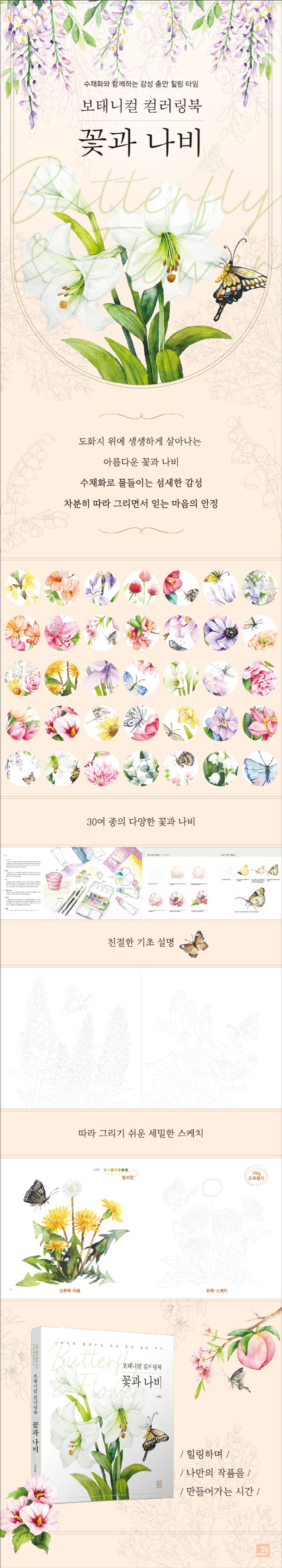 미술 분야에서 다방면으로 활동하고 있는 김명희 작가가 수채화로 선사하는 보태니컬 컬러링북이다. 우아한 꽃과 나비의 세계가 섬세한 붓 터치로 그려진다. 개나리, 무궁화, 민들레 같은 친숙한 꽃에서부터 아가판서스, 라넌큘러스, 다알리아 같은 화려한 꽃까지 다양하고 매력 있는 35종의 꽃을 만날 수 있다. 향기가 있는 꽃에는 나비가 모여들듯 각 꽃에는 어울리는 나비가 함께 그려져 있어 기존의 보태니컬 아트북과 차별화된다.