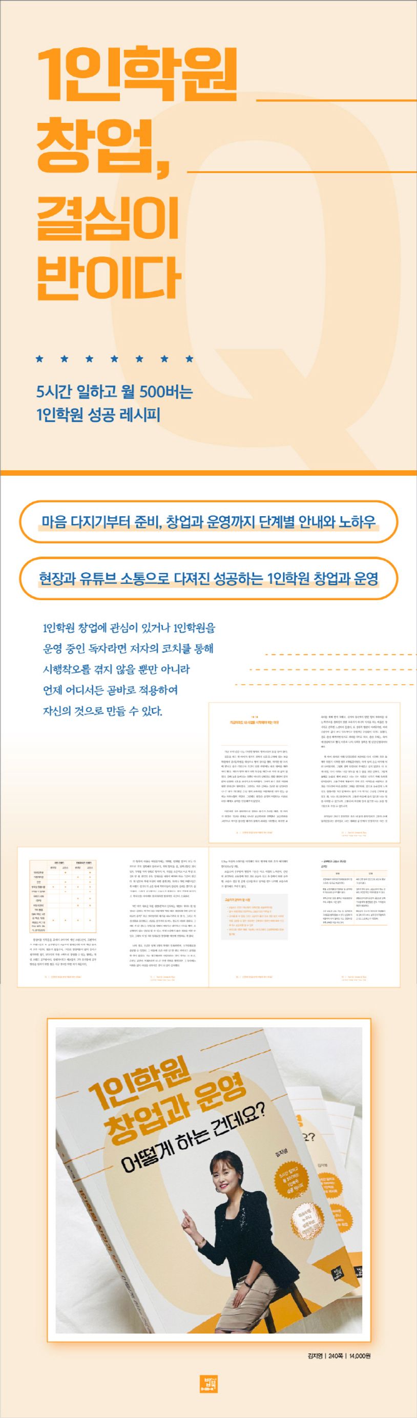 교습소 공부방 등, 원장 1인만이 가르칠 수 1인학원의 성공 창업과 창업 후 운영법을 알려준다. 이에 맞춰 1인학원을 창업하고 단 1년 만에 성공의 길에 들어선 저자가 그 성공 비법을 쉽고 명쾌하게 정리하여 고스란히 배우도록 한다. 제목처럼 ‘1인학원 창업과 운영, 어떻게 하는 건데요’라는 물음에 빈틈이 없도록, 마음 다지기부터 준비, 창업과 운영까지 단계별로 차근차근, 그리고 세밀하게 모든 노하우를 전하고 있는 것이다.