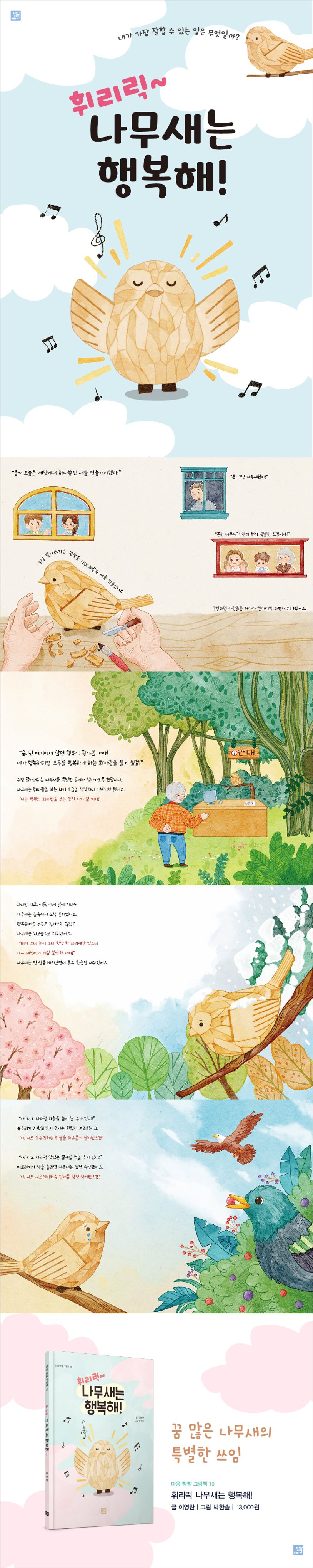 나무새는 행복의 휘파람을 부는 자신을 상상하며 기뻐합니다. 하지만 홀로 숲속을 지키는 나무새에게 행복이 찾아오기는커녕 외롭기만 합니다.