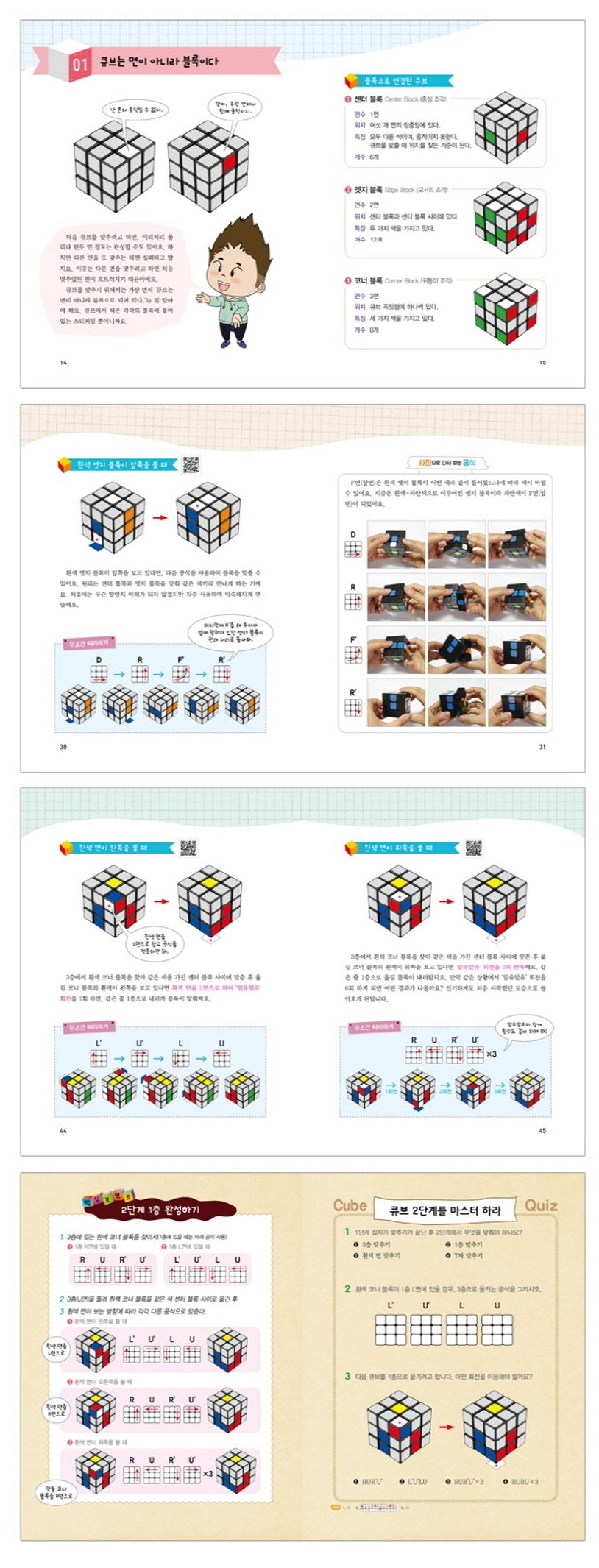 『어린이를 위한 왕초보 큐브스쿨』은 큐브에 관심은 많지만, 아직 한 번도 큐브를 완성해 보지 못한 왕초보 어린이를 위해 큐브의 구조와 명칭부터 차근차근 큐브 맞추는 7단계 방법을 자세하게 설명한 책입니다. 3×3×3 큐브를 맞추는 공식을 먼저 이해하고 손에 익힐 수 있도록 구성했습니다. 1~7단계 공식에서 어떤 블록이 어떤 위치로 이동하는지 먼저 알아보고, 각 상황에 맞춰 그 공식을 선택적으로 사용할 수 있습니다.