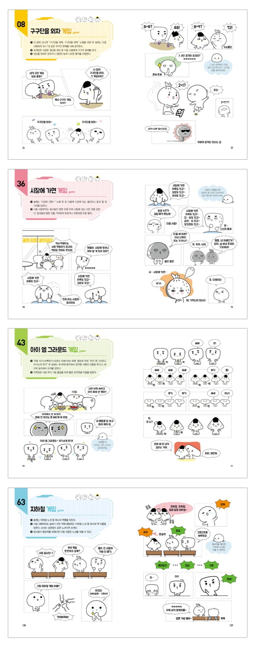 『읽으면서 바로 해 보는 어린이 게임』에는 널리 알려진 게임 외에도 새로운 게임 등이 담겨 있어요. 네이버 인기 웹툰 작가의 귀여운 캐릭터, 동그란 찹쌀떡 찹이, 만두 두야, 네모난 찹쌀떡 모네, 삼각김밥 쎄세, 가래떡 래야, 떡볶이 떡 뽀기가 직접 게임을 하며 배꼽이 빠질 만큼 재미있는 상황을 꾸며 게임 방법과 게임을 잘하는 방법, 벌칙을 피하는 방법 등을 설명했어요.