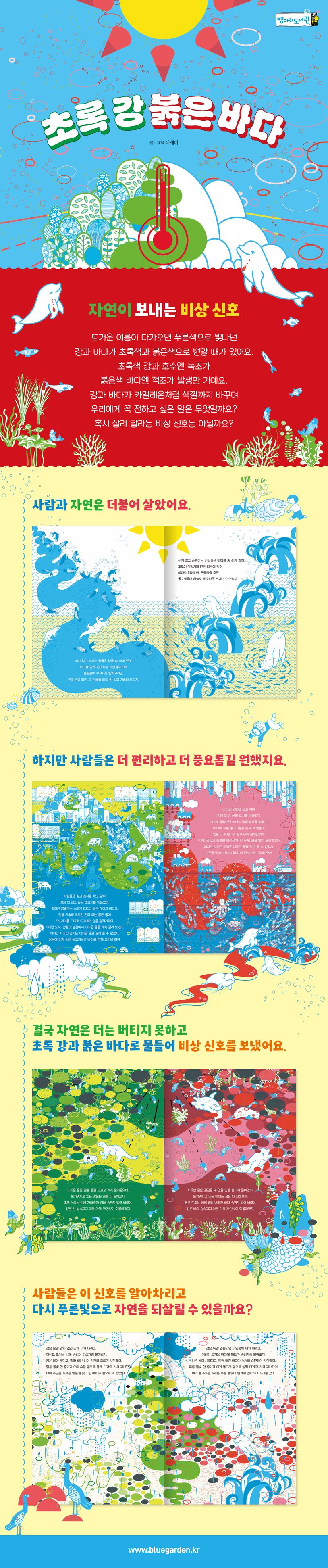 카멜레온처럼색깔을바꾼초록강과붉은바다가전하는비상신호기온이점점오르며더운여름이다가오면매년반복하여듣게되는뉴스가있습니다.이것만으로도우리는강물이초록빛으로물들고,바다가붉은빛으로물든장면을쉽게떠올릴수있을것입니다.먼옛날에도강과바다의색이변하였다는기록이남아있지만,지금처럼넓은지역에서오랫동안녹조와적조가발생하지는않았습니다.그렇다면왜녹조와적조는점점더심각해지는것일까요?가장큰원인은기후변화로인한수온상승이고,그다음으로도시와공장에서내보내는정화되지않은폐수와농경지에서흘러들어간비료를통한부영양화때문입니다.이것들은모두사람들이편안하고풍요롭게살기위한활동에서나오는부정적인결과물인것입니다.사람이녹조와적조를막을수는없다고합니다.하지만,최대한더디게발생하고최대한빠르게사라질수있도록우리가자연을도울수있지않을까요?강과바다가카멜레온처럼색깔까지바꾸며우리에게보내고있는비상신호를더이상놓치지않기를바랍니다.《초록강붉은바다》에서는사람과더불어살아가던푸른빛으로빛나던강과바다가,사람들의욕심으로초록빛과붉은빛으로점차변해가는과정을작가는강렬한그림으로보여주고있다.점점뜨거워지는지구,사람들의난개발,환경파괴,동물들의고통을고스란히느끼며자연의소중함을되새기게한다.*인증유형:공급자적합성확인