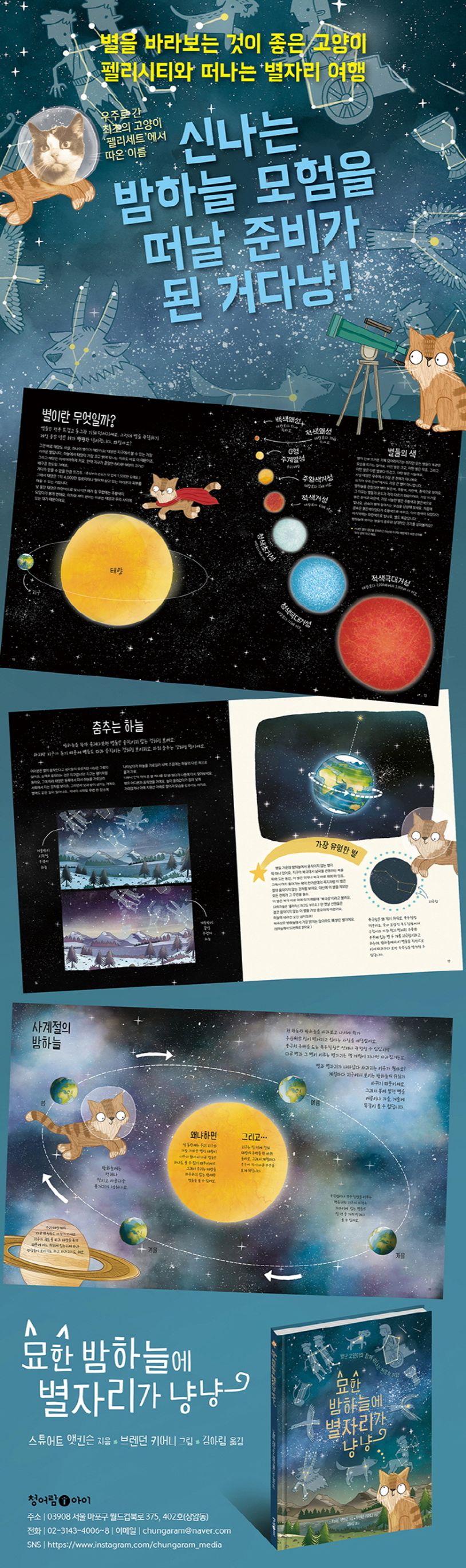 밤하늘은 누구나 관찰할 수 있고, 아직 밝혀내지 못한 미지의 존재가 가득한 곳이에요. 여러분도 밤하늘의 관찰자가 될 수 있지요. 하지만 밤하늘을 제대로 관찰하기 위해 어떤 것부터 시작해야 할지 모르겠다면, 『묘한 밤하늘에 별자리가 냥냥』 속 특별한 친구를 만나 보세요! 우주에 관해서라면 모르는 게 없는 별난 고양이가 여러분을 묘한 밤하늘의 세계로 안내해줄 거예요.