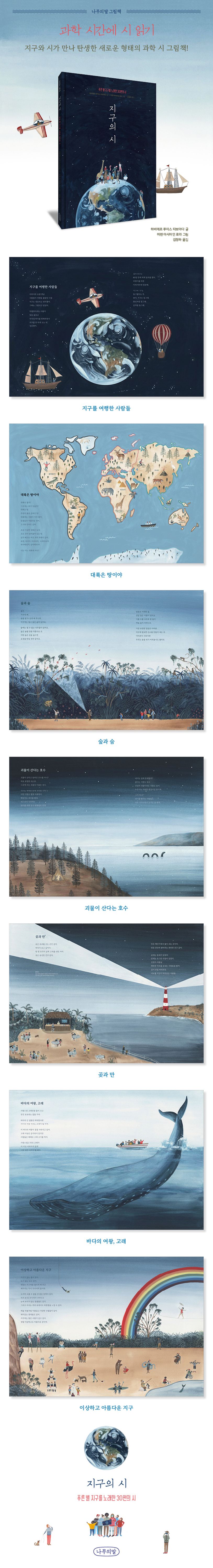과학은 어렵고 따분한 과목으로 생각되기 일쑤이다. 하지만 편식이 몸에 좋지 않듯 과학 또한 일상생활을 이해하는 데 없어서는 안 되는 학문이다. 과학을 재미있고 신나게 배울 수 있는 새로운 형식의 책이 있다면 세상을 이해하는 데 도움이 되지 않을까. 나무의말 신간 그림책 ≪지구의 시≫는 과학과 시가 만난 독특한 컨셉의 시 그림책이다. 우리가 매일매일 걷고 살아가는, 앞으로 살아갈 공간인 지구와 관련된 30개의 소재를 가지고 쓴 시들이다. 지구의 아름다움을 시인의 눈으로 새롭고 깊이 있게 바라보는 동시에 지구의 모양, 동서남북, 지구를 여행한 사람들, 나라와 대륙, 숲, 고원, 사막, 화산, 곶과 만, 태양과 달 등 지구의 지형적 특징을 살펴본다. ≪지구의 시≫는 ‘시 그림책’인 동시에 바람, 밀물과 썰물, 별똥별 등 지구라는 놀라운 행성을 둘러싸고 벌어지는 자연 현상에 대해서도 자연스럽게 만날 수 있는 ‘과학 그림책’이기도 하다. 물의 순환, 친환경, 자원 재활용 등 지구의 환경을 함께 생각하는 ‘환경 그림책’이기도 하다.