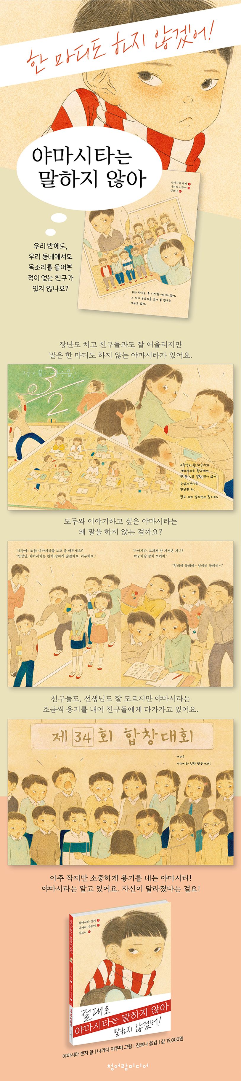 집에서는 가족들과 수다스러운 아이 야마시타가 어쩐 일인지 초등학교에서는 말을 한 마디도 하지 않습니다. 옆의 짝꿍은 야마시타의 목소리가 무척이나 궁금합니다. 반 친구들은 야마시타의 목소리가 듣고 싶어서 짓궂은 장난도 치고 놀리기도 하지만 야마시타의 목소리를 들은 친구는 아무도 없지요. 반 친구들이 신나게 떠드는 수업시간에도 너무 말이 없어서 선생님은 야마시타처럼 조용히 하라고 말씀하실 정도예요. 야마시타는 말을 못 하는 걸까요? 말하는 법을 모르는 걸까요? 말하기가 싫은 걸까요? 혹시 말을 하고 싶은데 잘 못할까 봐 안 하는 걸까요? 장난도 치고 친구들과도 잘 어울리지만 말은 한 마디도 하지 않는 야마시타. 하지만 쪽지를 주고받거나 몸짓으로 이야기를 나눌 수 있지요. 앗! 직접 말하기 어려울 땐 녹음을 해서 하고 싶은 이야기를 전달할 수도 있고요. 아주 작은 소리를 내어보기도 해요. 우리 반에도 우리 동네에서도 목소리를 들어본 적이 없는 친구가 있지 않나요? 조금 다를 뿐 우리는 친구가 될 수 있어요!