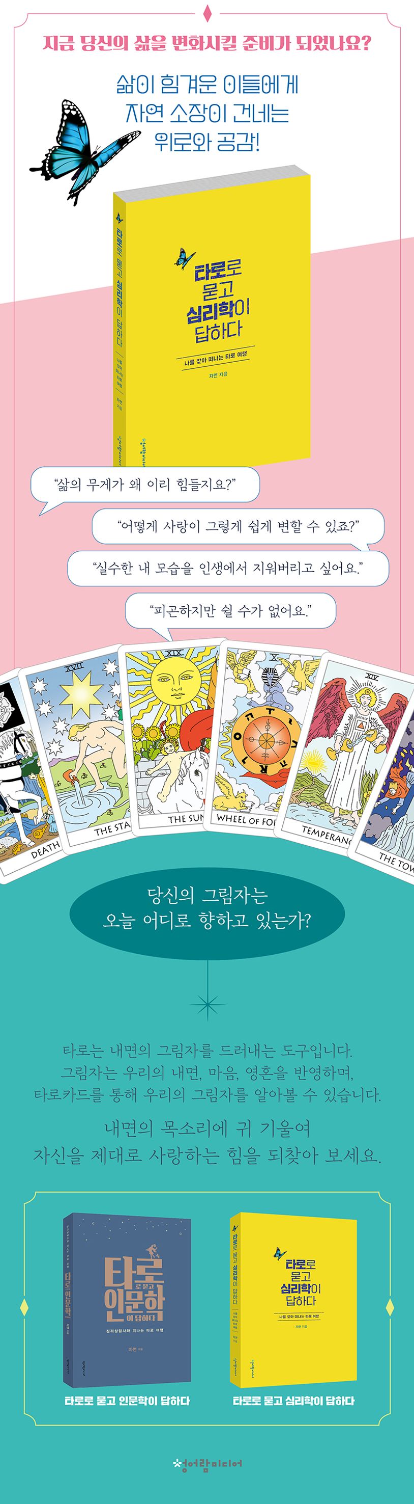오래전부터 심리상담과 타로를 접목하여 활발한 활동을 펼쳐온 ‘자연심리상담연구소’의 자연 소장이 두 번째 책을 출간하였습니다. 2017년에 출간된 첫 번째 책 『타로로 묻고 인문학이 답하다』는 그동안 독자들로부터 뜨거운 반응을 불러일으킨 바 있습니다. 신간은 저자가 상담을 통해 만난 사람들의 이야기와 내 삶의 여정에서 느꼈던 감정들을 담고 있으며, 우리가 살면서 겪게 되는 고민과 상처, 치유의 과정을 다루고 있습니다.