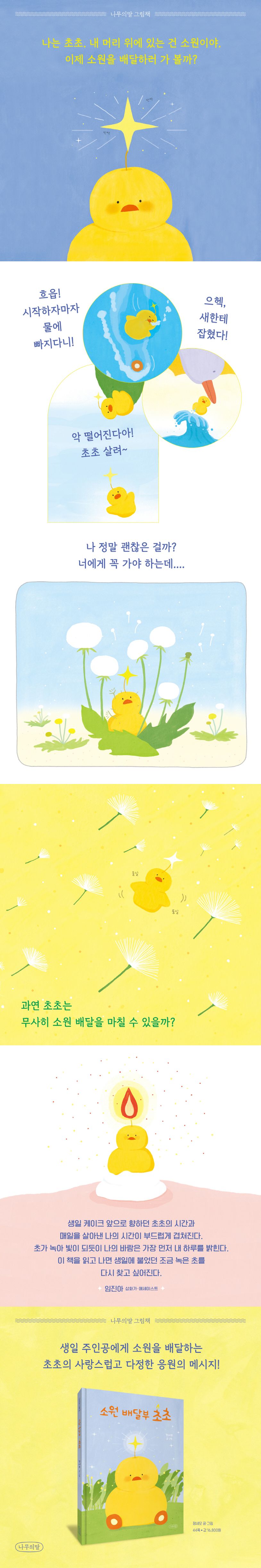 어느 푸른 밤, 별똥별 하나가 돌멩이 위로 떨어진다. 이윽고 돌멩이는 눈부시게 노란빛을 번쩍이며 갈라지고, 그 안에서 소원 배달부 초초가 깨어난다. 이제 막 걷기 시작한 아기 오리의 모습을 하고 머리 위 심지에는 반짝거리는 소원을 달고 있다. 초초는 데구루루 굴러가는 바퀴를 달고 소원의 주인공을 찾아갈 준비를 한다. ‘초초초초촙’ 귀여운 소리를 내면서 출발하는 초초는 소원 배달이 처음이라 걱정스럽지만 기대되고 설레는 마음도 든다.