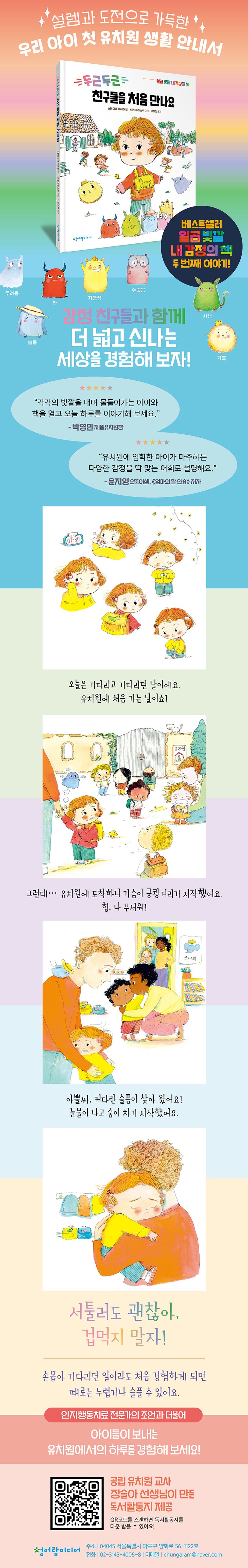 엄마 아빠 품을 떠나 유치원에서 보내는 첫날을 그려낸 『두근두근 친구들을 처음 만나요』는 아이가 새로운 환경에 대한 두려움을 극복하고 적응해나가는 과정을 섬세하면서도 사실적으로 담고 있다. 유치원이라는 곳은 아이가 태어나 처음으로 부모로부터 떨어져 오로지 혼자 힘으로 적응해야 하는 아주 낯선 환경이다. 또래 아이들과 한 공간에서 지내는 법을 배워야 하고 규칙과 약속을 잘 따라야 하는 등, 지금껏 부모 품에서 지내온 것과는 전혀 다른 생활을 해나가야만 한다. 즉, 사회생활의 첫 경험을 하게 되는 것이다. 아이와 부모는 이 책을 통해 유치원에서의 생활을 간접 체험할 수 있을 뿐만 아니라, 낯선 상황에서 마주치게 되는 크고 작은 감정을 스스로 컨트롤하는 자신감을 얻을 수 있다. 유치원이라는 작은 공동체 사회에 무사히 첫발을 내디딜 수 있게 길라잡이가 되어준다. 유치원에서의 첫날을 생생하게 그려낸 이 책은 비단 첫날뿐만 아니라 이후의 유치원 생활도 아이 스스로 잘 채워나갈 수 있게 하는 용기와 지혜의 첫 단추가 될 것이다.
