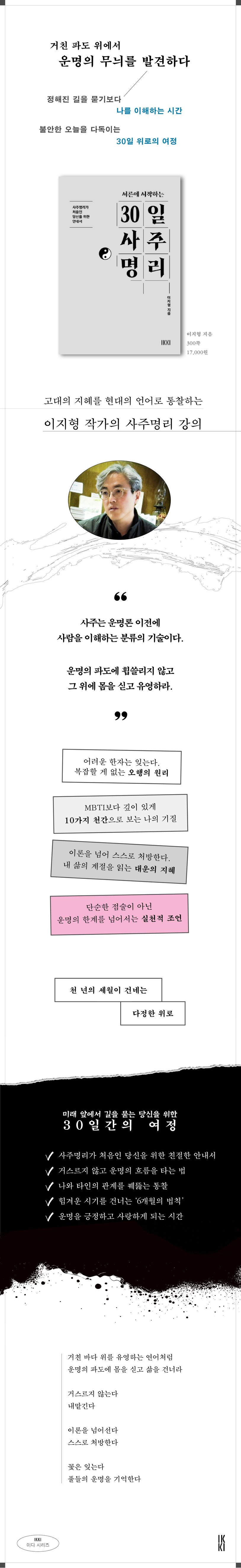 이 책은 난해하게만 느껴졌던 명리학의 세계로 독자를 안내하는 30일간의 여정이다. 10년 전 산속에서 조난당했지만 “바로 옆이 등산로”라는 구조대원의 말을 들어야 했고, 그 말대로 허무하게 구조되었던 저자의 경험처럼, 운명의 해법 또한 생각보다 가까운 곳에 있다. 저자는 사주가 단순히 미래를 맞히는 기술이 아니라, 막막한 삶 속에서 길을 잃은 이들에게 ‘바로 옆의 길’을 보여주는 나침반임을 이야기한다.
