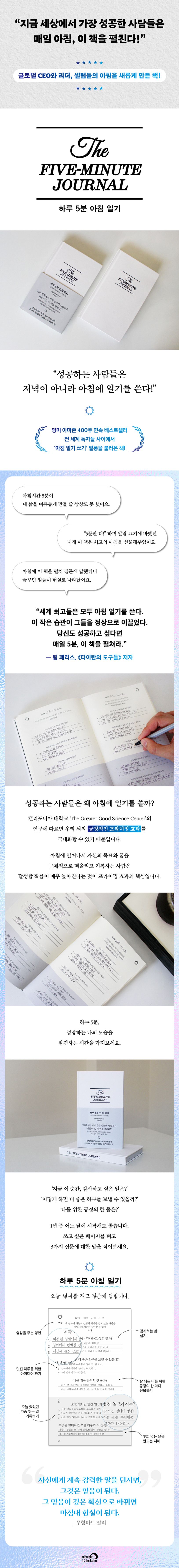 이 책은 캘리포니아대학교 산하 ‘The Greater Good Science Center’의 연구진을 비롯한 최고의 심리학자들이 다년간의 프로젝트와 임상실험 끝에 밝혀낸, 우리 뇌의 긍정적인 프라이밍 효과를 극대화할 수 있는 지혜로운 질문들을 담고 있다. 매일 아침, 이 질문들에 대한 답을 기록하는 습관을 통해 탁월한 성공을 거둔 CEO와 리더, 하이퍼포머들의 사례를 풍성하게 소개한다. 아울러 독자들이 직접 자신의 아침 일기를 쓸 수 있는 6개월 분량의 일기장이 함께 담겨 있다. 왜 하필 6개월인가? 긍정심리학의 최신 연구결과에 따르면, 우리가 좋은 습관을 몸에 배게 하는 데 걸리는 최적의 시간이 바로 6개월이기 때문이다. 2013년 출간 후 지금껏 무려 400주 연속 영미 아마존 베스트셀러 행진을 하고 있는 이 책을 침대 옆 탁자 위에 올려놓고 아침저녁으로 5분의 시간을 내 지혜로운 질문에 답해보라. 6개월 후 당신은 완전히 다른 삶을 살게 될 것이다
