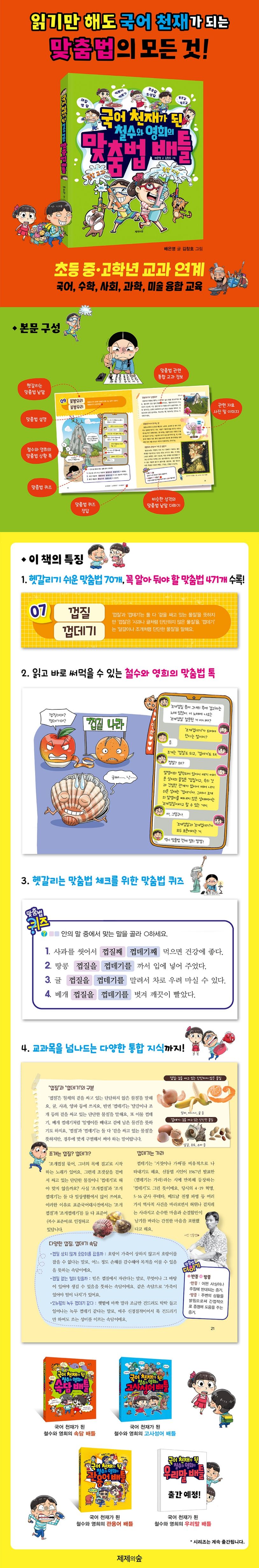 ⟪국어 천재가 된 철수와 영희의 맞춤법 배틀⟫은 누구라도 쓰는 톡으로 재치 있으면서도 흔히 볼 수 있는 일상 속에서 헷갈리기 쉬운 맞춤법 관련 상황을 보여 주고, 그에 따른 꼭 알아 두어야 할 맞춤법 70개를 알려 준다. 더불어 해당 맞춤법과 관련된 전 교과를 총망라하는 통합 지식은 물론, 관련된 교과서 맞춤법 471개를 배울 수 있다. 초등 중ㆍ고학년이라면 누구라도 한 단계 높은 관용어 활용으로 국어 천재로 가는 길이 열릴 것이다.