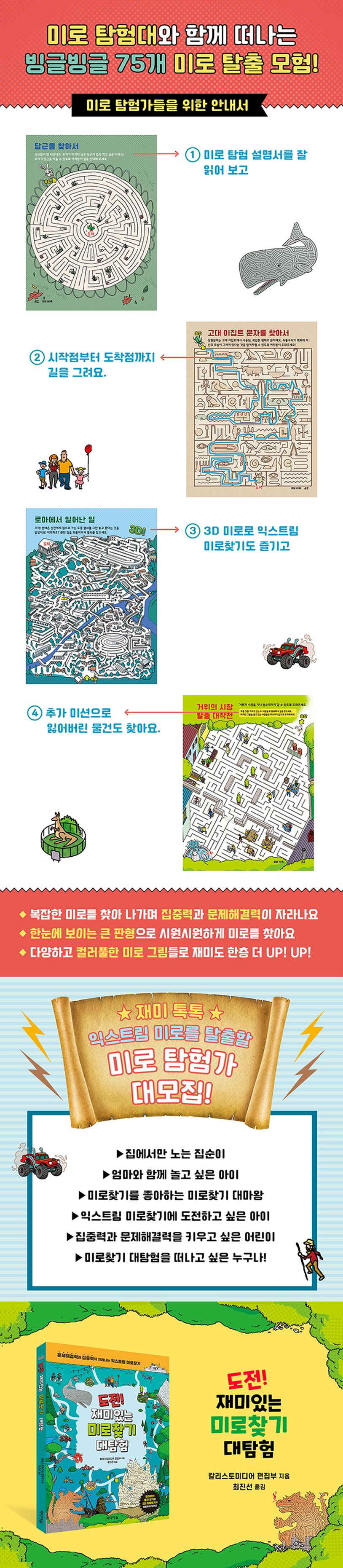 미로 찾기 탐험을 시작해 보세요. 이 책에는 우주 탐사, 대저택의 미로공원, 꼬불꼬불 카멜레온 혓바닥, 특급 비밀 작전, 톱니바퀴 미로, 신비의 파라오 미로 등 75가지 재미있는 미로들이 가득해요. 미로탐험대와 함께 미로를 탈출하며 문제해결력을 키울 수 있고, 공간을 이해하고 길을 찾으며 관찰력과 집중력도 쑥쑥 자라나요. 지구를 벗어나 우주로까지, 진짜 탐험가가 된 여러분을 기대할게요!