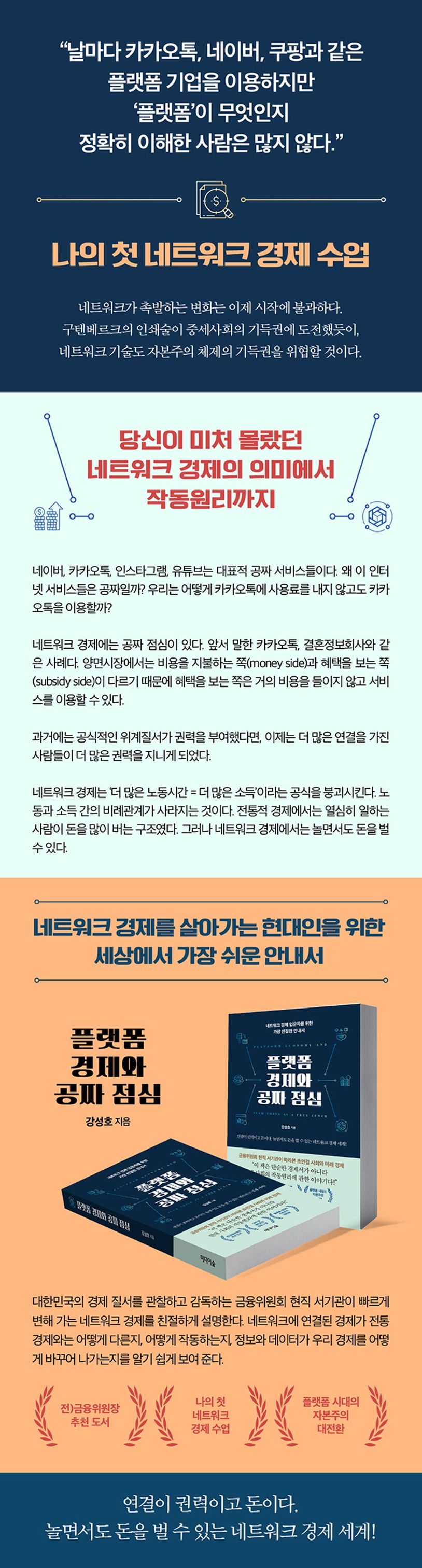 플랫폼 기업과 대비해서 일컫는 말)과 어떻게 다른지를 알려준다. 이 책은 새로운 경제 질서에 대한 책이다. 독자들은 이 책을 통해 플랫폼 기업이 무엇인지, 네트워크 경제는 어떻게 작동하는지에 대한 훌륭한 통찰력을 얻을 수 있을 것이다. 또한 지금도 계속하여 성장을 거듭하고 있는 카카오와 네이버와 같은 플랫폼 기업의 현재와 미래를 이해하기 위해 반드시 읽어야 할 필독서다.