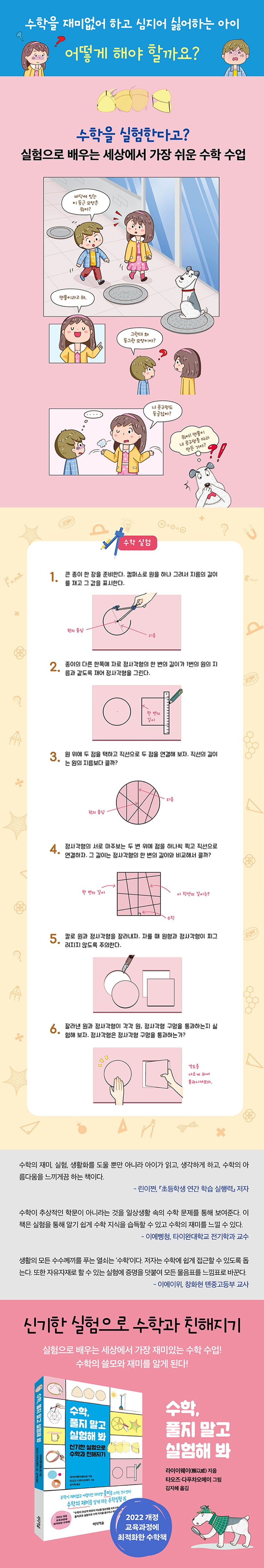 그렇다면 수학 역시 손으로 직접 경험해서 그 실체를 확인할 수 있다면 어떨까? 이 책의 저자는 누구에게나 호기심과 흥미가 느껴지는 재밌는 실험을 통해 수학과 친해질 수 있는 계기를 제공한다.