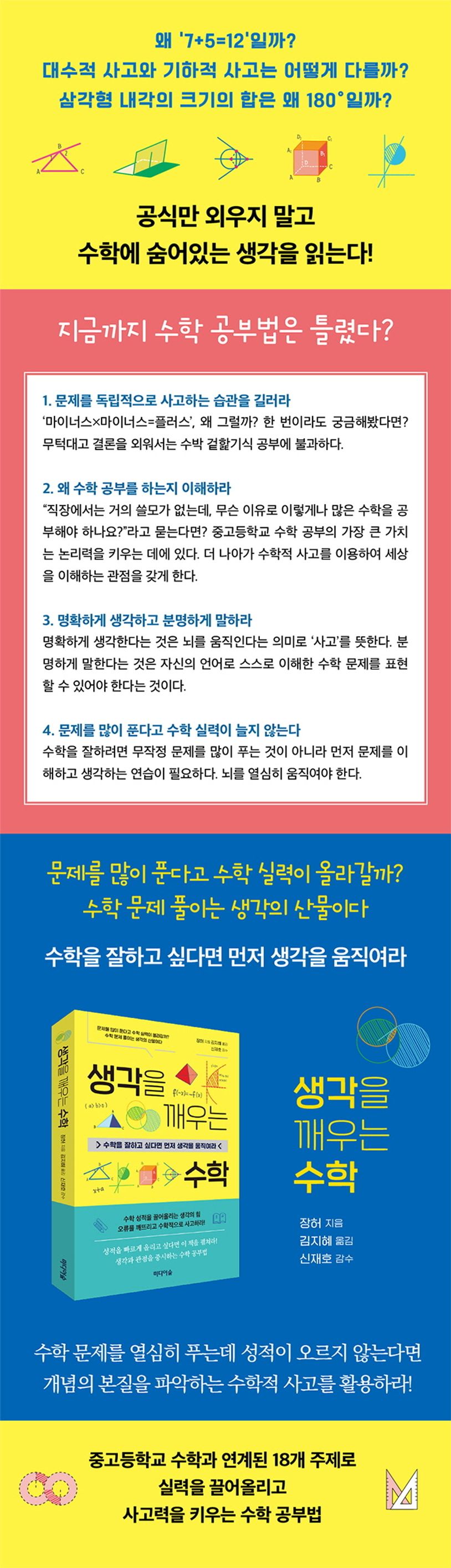 수학의 탈출구가 보이지 않아 답답한 학생들의 속마음을 시원하게 뚫어줄 책이 출간되었다. 『생각을 깨우는 수학』은 중고등학교의 중요한 단원 내용을 반영한 18개 주제를 포함하고 있다. 도형, 식, 그래프 등을 기하와 대수의 관점에서 이해하고 문제의 본질을 파악하여 그동안의 수학 공부 체계를 완전히 새롭게 바꿀 수 있다. 학생들은 작은 문제 제기로 시작하는 각 소주제를 공부함으로써 문제를 독립적으로 이해하고 수학적 사고를 깨쳐 실력을 점차 끌어올릴 수 있다. 이와 더불어 데카르트, 유클리드 등 대수학자의 가르침과, 한 단계 더 나아가 배운 것을 바탕으로 심화 문제를 생각해볼 수 있는 ‘매스토크(MATH TALK)’가 있어 스스로 수학을 학습하는 재미를 느낄 것이다.