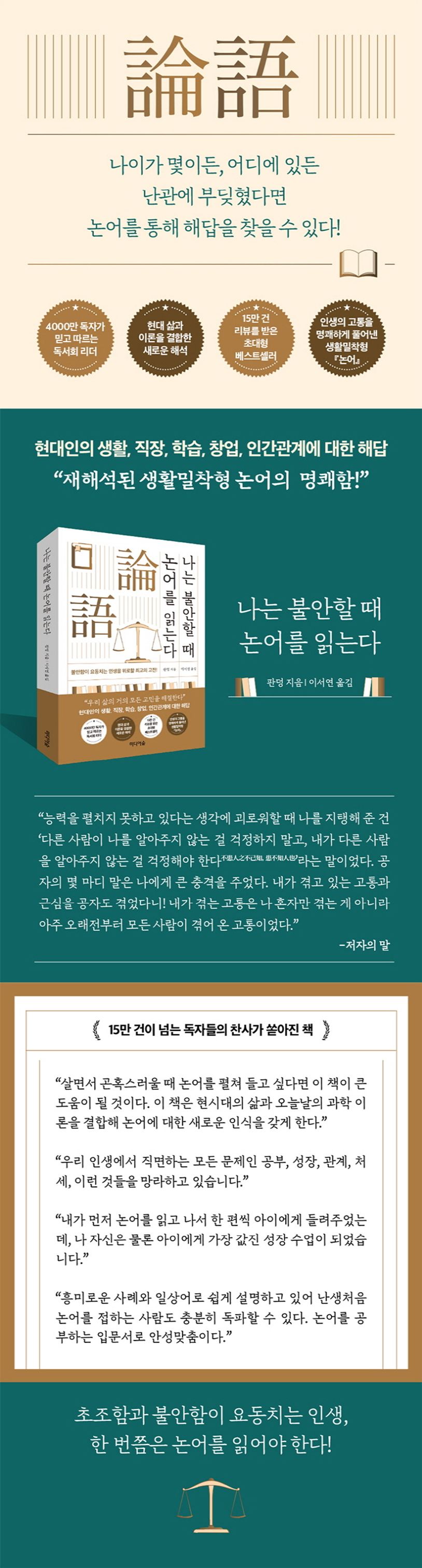 『논어』는 동양 최고의 고전으로 수많은 해석본이 출간되어 있지만 저자는 이 책 『나는 불안할 때 논어를 읽는다』에서 특별히 실생활에 응용할 수 있도록 『논어』를 친절하게 설명한다. 현대의 삶을 렌즈 삼아 『논어』를 해석해 새로운 생명을 부여한 것이 이 책의 특징이다. 현대 과학에 근거한 이론으로 공자의 주장을 검증하고, 흥미 넘치는 다양한 사례를 통해 초등학생도 이해할 정도로 아주 친절하게 공자의 가르침을 전한다. 공자의 지혜와 처세를 오늘의 현실에 맞게 들려주는 이 책으로 우리 현대인들이 걱정하는 생활, 직장, 학습, 창업, 인간관계에서 맞닥뜨리는 삶의 거의 모든 문제를 해결할 수 있을 것이다.