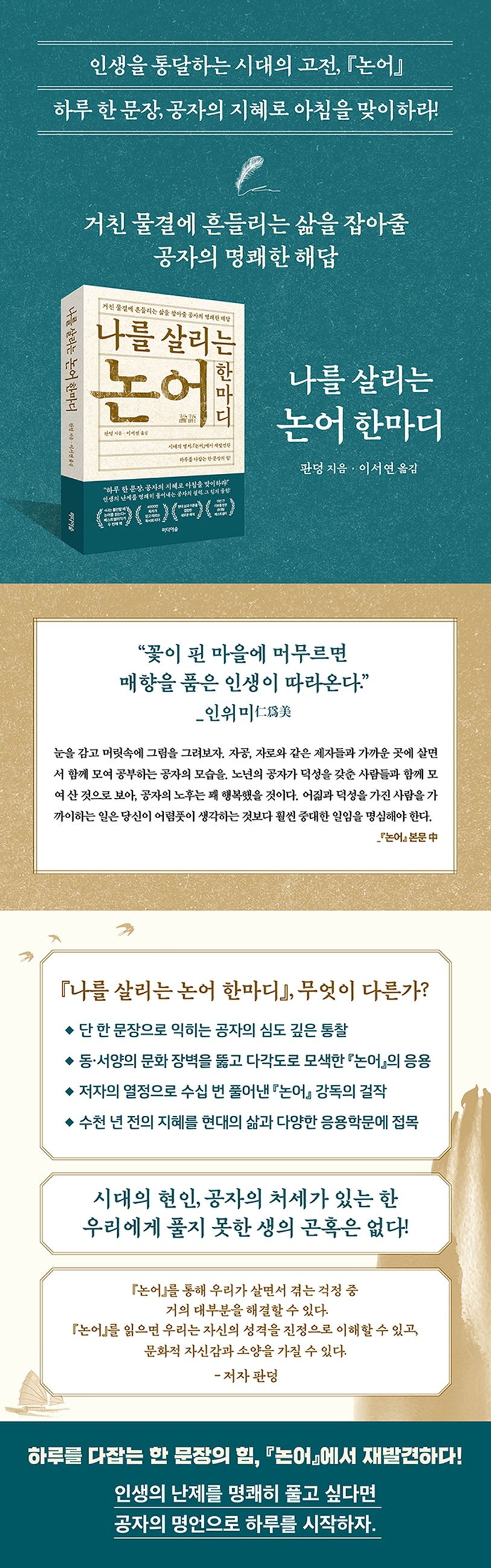 이 책은 『나는 불안할 때 논어를 읽는다』에 이어 『논어』의 4, 5, 6편을 실었다. 『논어』의 1, 2, 3편을 담은 전작이 배움과 위정, 예법, 공자가 사랑한 음악에 관한 이야기를 건넸다면, 이번 『나를 살리는 논어 한마디』에서는 공문십철에 해당하는 제작들의 이야기 속에 담긴 공자의 명언을 담았다. 공자가 늘 강조했던 어짊, 중용, 효와 충, 그리고 군자다움에 이르기 위해 갖추어야 할 덕목들이 무게가 실린 하나의 문장으로 재탄생되었다.