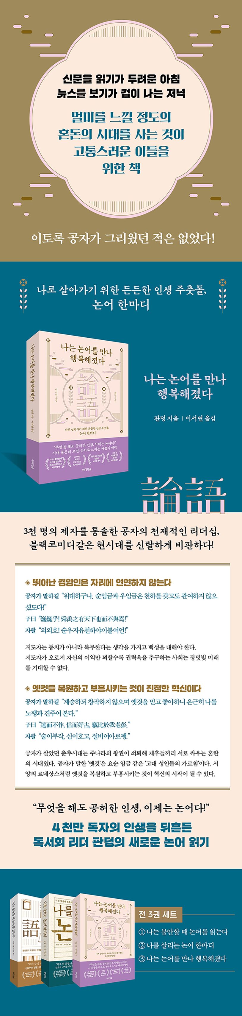 수천 년 전의 책이 여전히 사랑을 받고 있다면 이는 단 한 가지 이유다. 여전히 책의 가치가 그 시대에 추앙받고 있기 때문이다. 특히 삶이 버겁고 고통스러울 때 많은 사람은 멘토가 될만한 인물의 처세와 지혜를 찾는다. 세상은 급속도로 변화를 맞이하며 극도의 편리함과 편안함을 제공하고 있지만 내면은 여전히 공허하고 허탈하다. 이 어지러운 시대에 우리는 다시금 옛 위인의 지혜를 탐색하게 된다. 그리고 그 정수가 바로 『논어』이다.