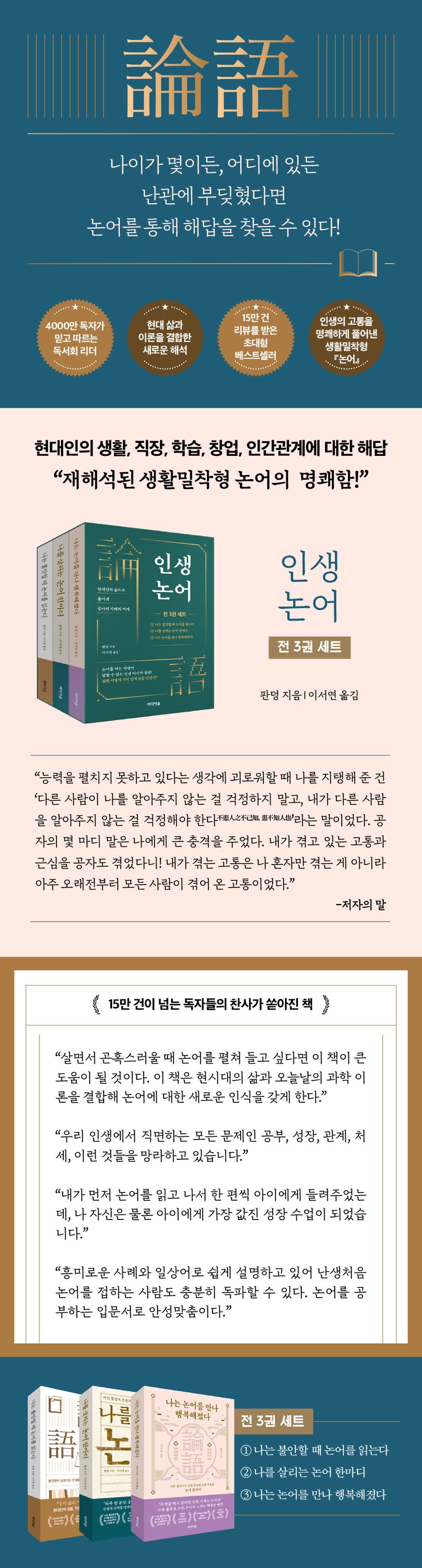 『인생 논어』는 그동안 출간되었던 『나는 불안할 때 논어를 읽는다』의 「학이 편」, 「위정 편」, 「팔일 편」, 『나를 살리는 논어 한마디』의 「리인 편」, 「공야장 편」, 「옹야 편」, 『나는 논어를 만나 행복해졌다』의 「술이 편」, 「태백 편」, 「자한 편」을 묶어 인생에 한 번쯤은 꼭 읽어야 할 『논어』 시리즈로 완결했다. 딱딱한 한문체의 문장이나 모호하고 추상적인 옛 용어들을 최대한 배제하고 현대적인 용어와 일상어로 공자의 깨달음을 알기 쉽게 설명한다.