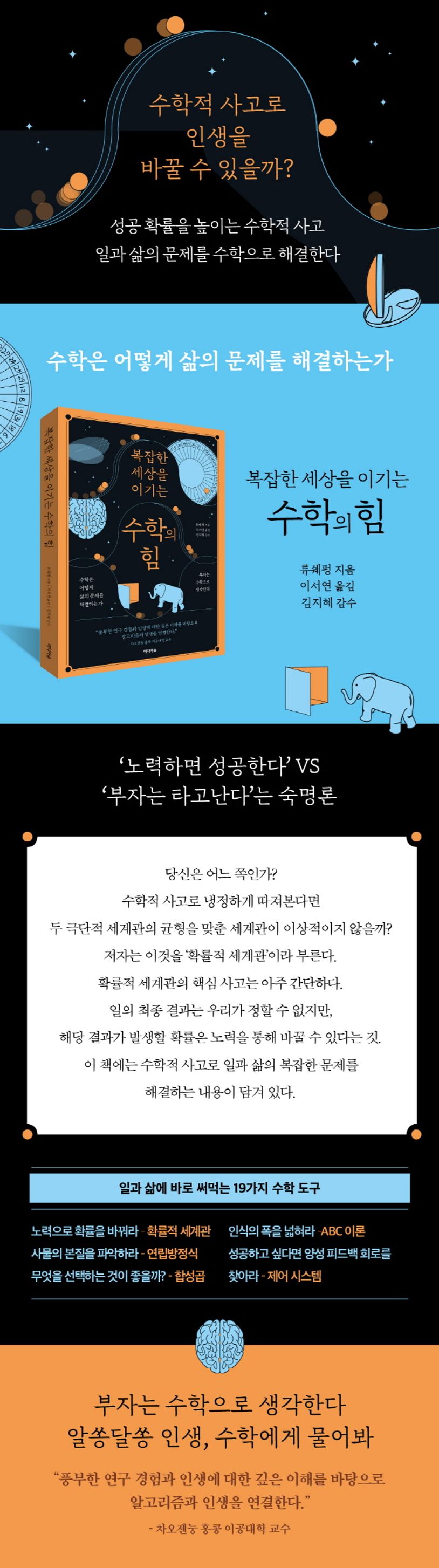 이 책의 저자 류쉐펑 교수는 수학적 사고를 통해 인생을 바꿀 수 있다고 강조한다. ‘노력하면 성공한다’는 생각을 가진 사람과 ‘운명은 정해져 있다’고 생각하는 사람을 비교하면서 두 사람의 가치관이 올바르지 않다고 설명한다. 열심히 노력했는데도 원하는 결과를 얻지 못한 사람은 쉽게 좌절하고, 팔자는 정해져 있으니 굳이 힘들게 노력할 필요가 없다고 생각하는 사람은 성공할 가능성에서 멀어지기 때문이다. 저자는 수학적 사고를 통해 확률적 세계관을 가져야 한다고 말한다. 결과를 장담할 순 없지만 노력으로 성공 확률을 높일 수 있다고 생각하는 사람이 쉽게 좌절하지 않으면서 마침내 성공의 문턱을 넘을 수 있다는 사실을 증명한다.