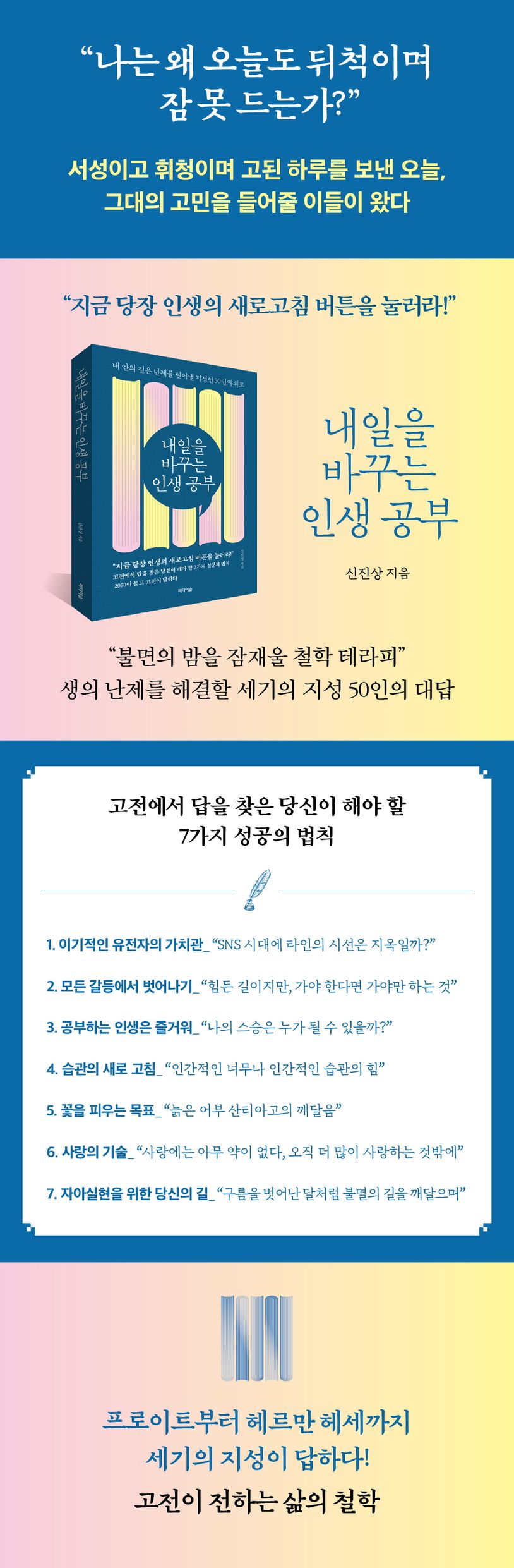 저자가 안내하는 고전으로의 여행의 마지막 종점에 이르면 우리는 어느새 인생의 문제들에 대한 정답을 찾게 된다. 고전에서 답을 찾은 당신이 해야 할 7가지 성공의 법칙이다.