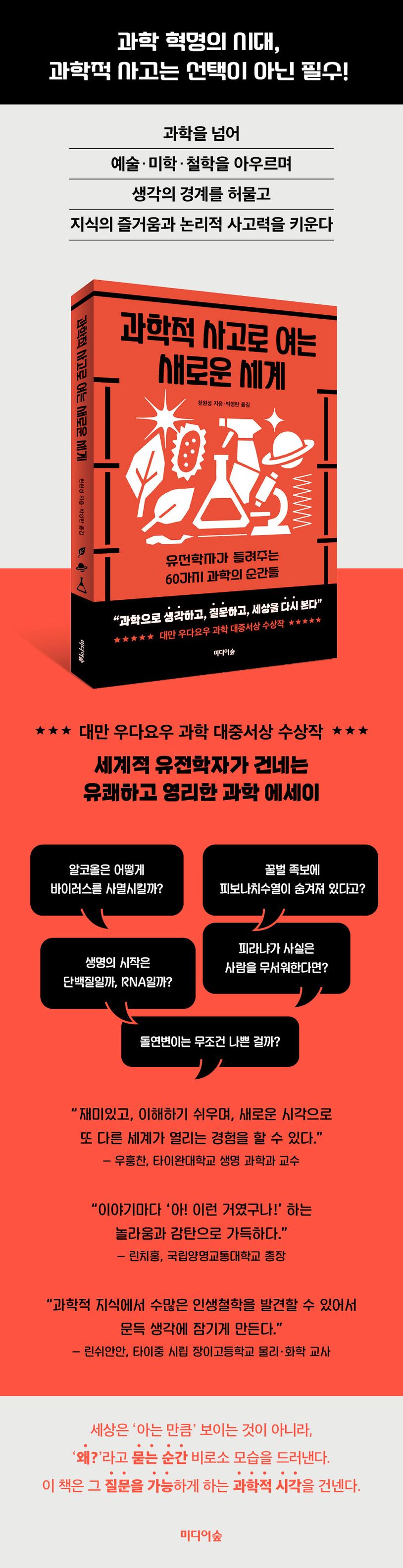 대만에서는 이 책을 두고 “교과서 밖에서 살아 숨 쉬는 과학”이라는 평가가 이어졌다. 또 고등학교 과학 교사는 “이 책은 그야말로 과학의 즐거움을 누비는 즐거운 여정”이라고 평했다. 과학자의 글이 이렇게 따뜻하고 재미있고 흥미진진할 수 있을까? 이 책이 그걸 증명한다.