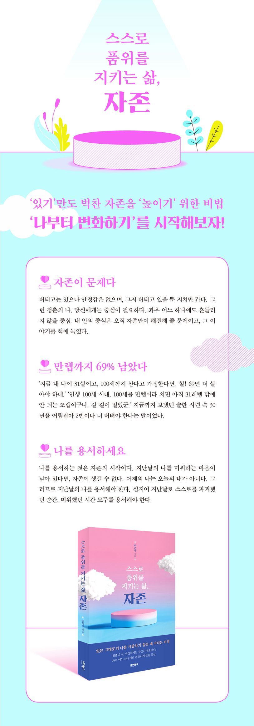 조금 특별한 직장인의 자존 생존기. 지금 흔들리는 많은 사람들, 특히 청춘에게 필요한 것이 자존이라고 생각하는 저자 손은경이 자존은 타고나는 것이 아니라 꽃에 물을 주듯 조금씩 키워나가는 것이라는 사실을 전하고 싶어 《스스로 품위를 지키는 삶, 자존》이라는 책을 낸다. 그녀만의 자존 생존기인 이 책에는 있는 그대로의 나를 사랑하기 힘들 때 버티는 비결이 담겨 있다. 본격적인 변화는 누군가에게 사랑받기를 기대하는 마음보다, 나부터 나를 사랑하는 것에서부터 시작할 수 있다. 그것이 가장 빠른 변화의 시작이면서, 가장 어려운 시작이다. 그 길에 이 책이 함께하기를 바란다.