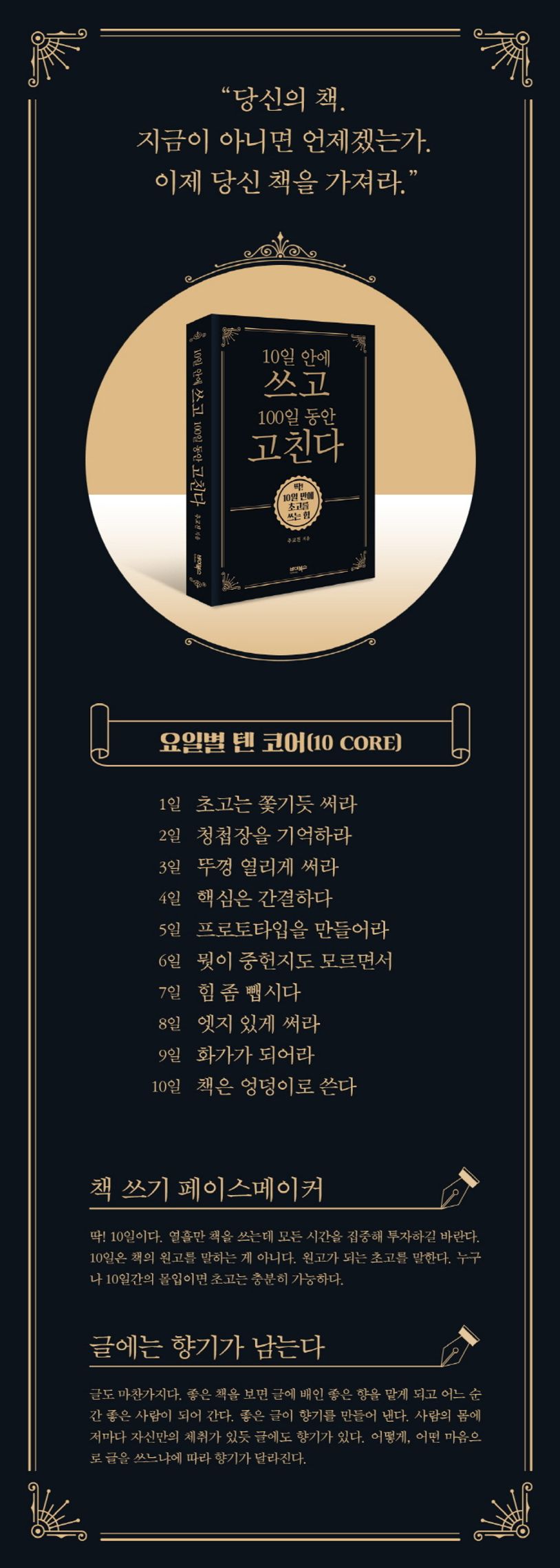힘겨운 책 쓰기 과정을 돕는 페이스메이커. 플라이펜 책 쓰기 대표로 책을 쓰고 싶어 하는 이들을 위해 책 쓰기 지도와 강의를 하고 있는 저자 추교진이 10일 만에 초고를 쓰는 비법을 담은 《10일 안에 쓰고 100일 동안 고친다》를 세상에 내놓는다. 책을 쓰는 과정에서 오는 좌절, 자기 의심과 불안, 때에 따라 오는 수많은 감정 기복을 느낄 사람들을 다독이는 책이다. 이 책은 단순히 책을 빨리 쓰는 요령을 가르쳐주는 것이 아니라, 글에 향기를 담으려고 노력하는 사람들을 응원한다. 저자는 이 책이 독자에게 방향을 알려주는 북극성이 되기를 바란다. 그래서 머지않아 각자의 책으로 서로 인사 나누는 날을 기대한다.