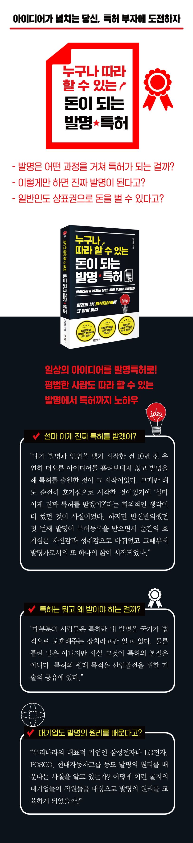 평범한 사람도 따라 할 수 있는 발명에서 특허까지 노하우. 현재 의료직에 종사하고 있는 저자 김상준이 발명가이자 발명교육가로서 활동하면서 깨달았던 노하우와 발명의 원리들 및 특허를 받는 과정에서 도움이 되고 꼭 알아야 할 내용들을 정리해 《누구나 따라 할 수 있는 돈이 되는 발명·특허》를 세상에 내놓는다. 저자는 ‘대체 발명을 왜 배워야 하냐?’는 질문에 앞으로의 세상이 창의적인 인재들을 절실히 원하고 있고 발명이야말로 이런 창의성을 성장시킬 수 있는 가장 확실하고 효과적인 방법이기 때문이라고 답한다. 이 책을 통해 창의성을 성장시키고 잠재된 능력을 일깨우는 계기를 만들 수 있길 기대한다.