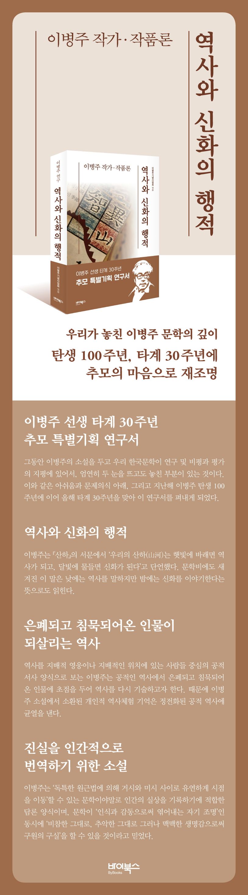 이병주 선생 타계 30주년 추모 특별기획 연구서. 1992년에 타계한 작가 이병주는, 당대의 한국문학에 보기 드문 면모를 남긴 인물이었다. 그럼에도 불구하고 그동안 이병주의 소설을 두고 우리 한국문학이 연구 및 비평과 평가의 지평에 있어서, 엄연히 두 눈을 뜨고도 놓친 부분이 있었다. 따라서 지난해 이병주 탄생 100주년에 이어 올해 타계 30주년을 맞아 이병주기념사업회가 추모 특별기획 연구서를 엮어 『역사와 신화의 행적』이란 제목으로 세상에 내놓는다. 역사를 기록하는 소설가라는 이병주에 대한 작가·작품론을 모은 이 책을 통해 진실을 인간적으로 번역하기 위한 소설을 쓴 대가의 품격을 떠올려보길 기대한다.