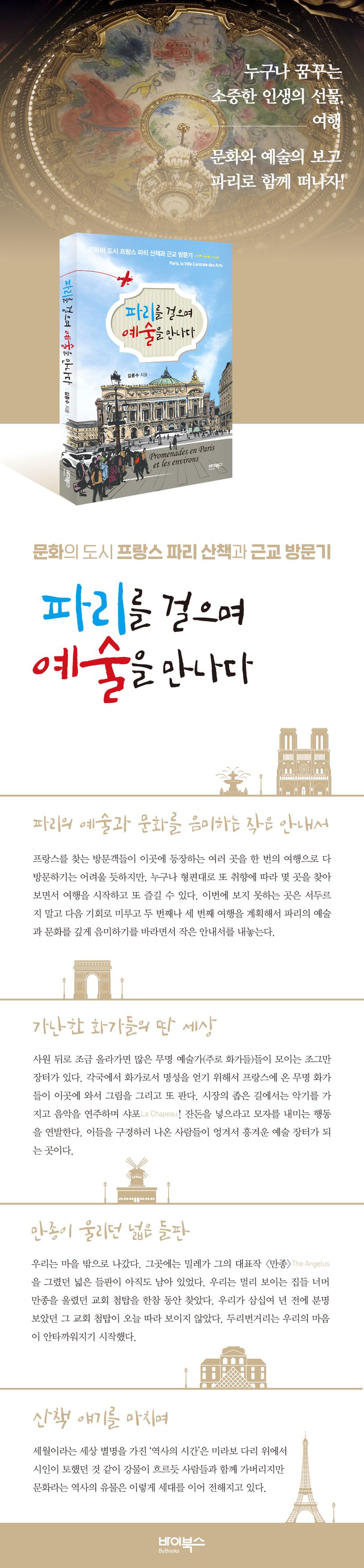 문화의 도시 프랑스 파리 산책과 근교 방문기. 주재원으로 파리에 장기간 체류했고 수시로 방문한 경험이 있는 저자 김종수가, 파리의 예술과 문화를 음미하는 작은 안내서인 《파리를 걸으며 예술을 만나다》를 세상에 내놓는다. 문화의 도시 프랑스 파리 산책과 근교 방문기인데, 파리의 풍경을 엿볼 수 있는 사진과 함께 저자만이 줄 수 있는 깊이 있는 시각과 정보가 돋보인다. 이 책은 프랑스와 그리고 문화를 가꾸고 보존하려는 파리 시민의 문화 의식을 잘 이해하게 되길 바라는 마음으로 썼다. 여기에 소개된 파리 시내와 주변 몇 곳은 역시 파리 시와 부근 가운데 작은 일부에 불과하다. 다만 이 책을 발판 삼아 문화의 도시 파리를 제대로 즐길 수 있기를 기대한다.