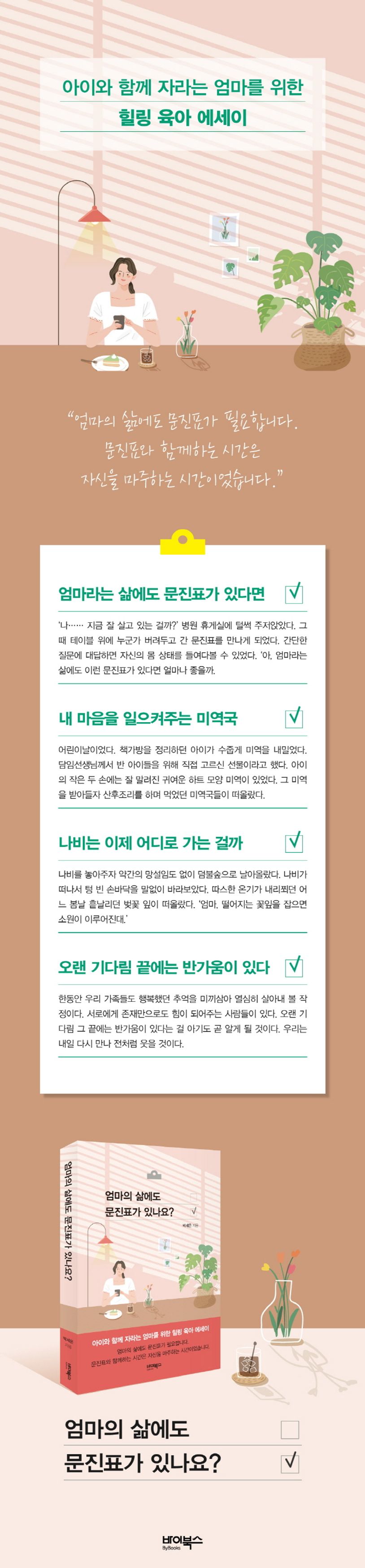 아이와 함께 자라는 엄마를 위한 힐링 육아 에세이. 사람들과 같은 호흡으로 소통하고 싶어 글을 쓰기 시작한 저자 박세은이 《엄마의 삶에도 문진표가 있나요?》를 세상에 내놓는다. 늘 물음표 투성이인 엄마의 삶을 이젠 스스로 피어나는 꽃이 될 수 있도록 응원하는 글들이 담겨 있다. 끝없는 돌봄 노동 속에 지친 많은 엄마들과 함께 공감하고 위로가 되기를 기원한다. 이 책은 그리운 사람에 대한 기다림과 같은 책이다. 여러모로 힘든 시기를 보내고 있는 우리에게 자신의 아픔을 되돌아볼 수 있는 계기를 만들어준다. 그러면 서로에게 존재만으로도 힘이 되어주는 사람들을 발견하게 된다. 오랜 기다림 끝에는 반가움이 있기 마련이다.