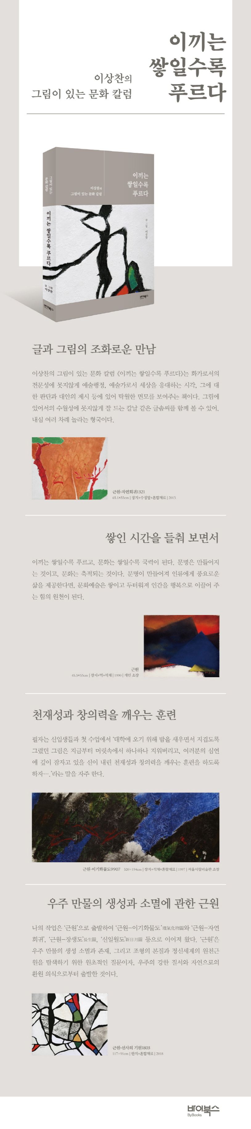 우경 이상찬의 그림이 있는 문화 칼럼. 우경 이상찬은 석채(石彩)를 이용하여 이기설(理氣說)을 회화적으로 표현해 오면서 동유(銅釉), 테라코타, 수제한지 등, 다양하고 폭넓은 재료의 실험과 오방색을 통한 주체적 미의식으로 한국화의 새로운 지평을 열었다는 평을 받고 있는 화가이다. 그가 이번에 그림이 있는 문화 칼럼인 《이끼는 쌓일수록 푸르다》를 세상에 내놓는다. 이 책은 우주 만물의 생성과 소멸에 관한 근원을 궁구하는 작가 의식과 닮았다. 화가로서 작품이 보여주는 심미안뿐만 아니라 미술계와 관련된 다양한 문제에 대한 깊이 있는 통찰도 제시하기 때문이다. 더 나아가 이 모든 것이 삶을 풍요롭게 만드는 문화이기에 우리 삶과 동떨어질 수 없다는 점에서 중요하다.