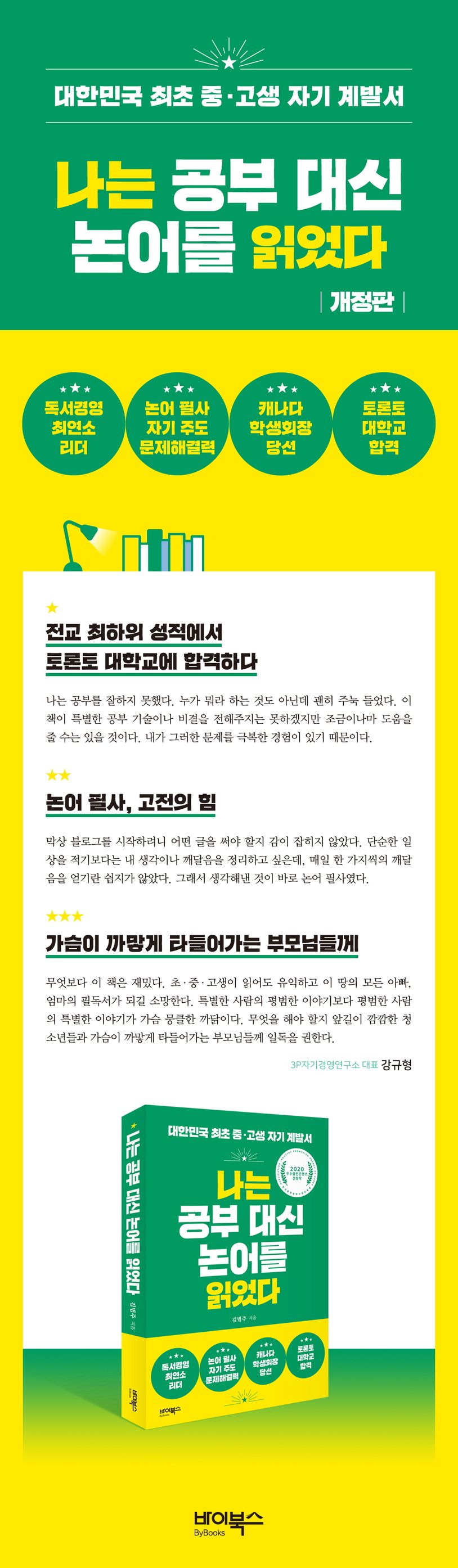 대한민국 최초 중·고생 자기 계발서 《나는 공부 대신 논어를 읽었다》의 개정판. 중3 때 미국 단기 유학을 떠나기 전까지 학교 성적이 전교 최하위권이었던 저자 김범주가 고3 때 전교 학생회장이 되고 토론토 대학교까지 합격한 변화의 과정을 담은 책이 《나는 공부 대신 논어를 읽었다》이다. 사춘기와 반항이 시작될 중1 무렵 우연히 나간 독서 모임이 계기가 되어 책과 친해질 수 있었고, 논어 필사를 통해 정신적인 성장을 경험한 덕분에 그런 성과를 이룰 수 있었다. 한국출판문화산업진흥원의 ‘2020년 우수출판콘텐츠 제작 지원’ 사업 선정작인 이 책은 평범한 사람의 특별한 이야기다. 누구라도 자신의 삶에 적용할 수 있는 방법이라 한 번 읽어볼 필요가 있다. 무엇을 해야 할지 앞길이 깜깜한 청소년들뿐만 아니라 가슴이 까맣게 타들어가며 청소년 자녀를 키우는 대한민국의 모든 학부모님들에게 강추하고 싶다.